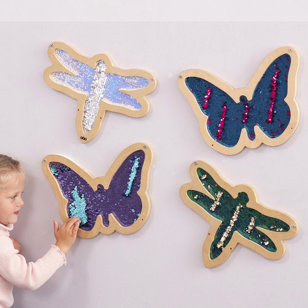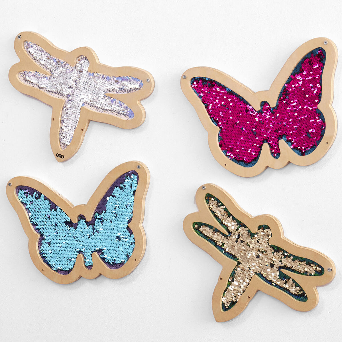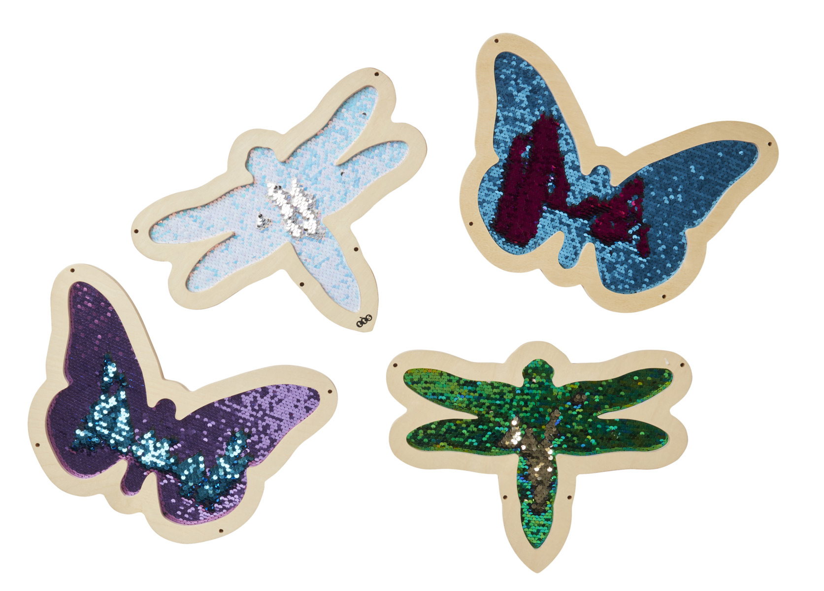 4 st/fp. Härliga interaktiva tavlor med glittrande fjärilar och trollsländor. Barnen fascineras av paljettena och tränar motorik och öga-handkoordination. Mått: B35xH24 cm. PVC-fri. Från 3 år.