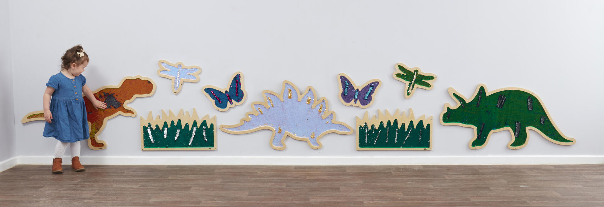 3 st/fp. Glittrande dinosaurier med en taktil och fascinerande yta. Paljetterna lockar till att träna finmotoriken och skapa mönster. (Fjärilar, trollsländor och gräsbrädor ingår inte.) Mått: Stegosaurus B106xH56 cm, Triceratops B108xH52 cm, T-Rex B110xH47 cm. PVC-fri. Från 3 år.