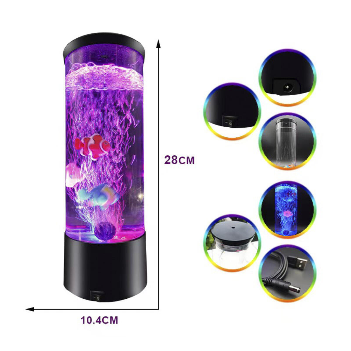 Ett upplyst akvarium med maneter. Det finns olika belysningsalternativ: att ha en färg eller en ljusshow på 6 olika färger. De konstgjorda maneterna rör sig på ett naturligt och realistiskt sätt. Luftpumpen trycker in luft i vattnet vilket gör att maneterna rör sig. LED-lampor. Efter 4 timmar stängs den av automatiskt. Den rymmer ca 3,9 liter vatten. USB kabel medföljer. Mått: 15x35 cm.