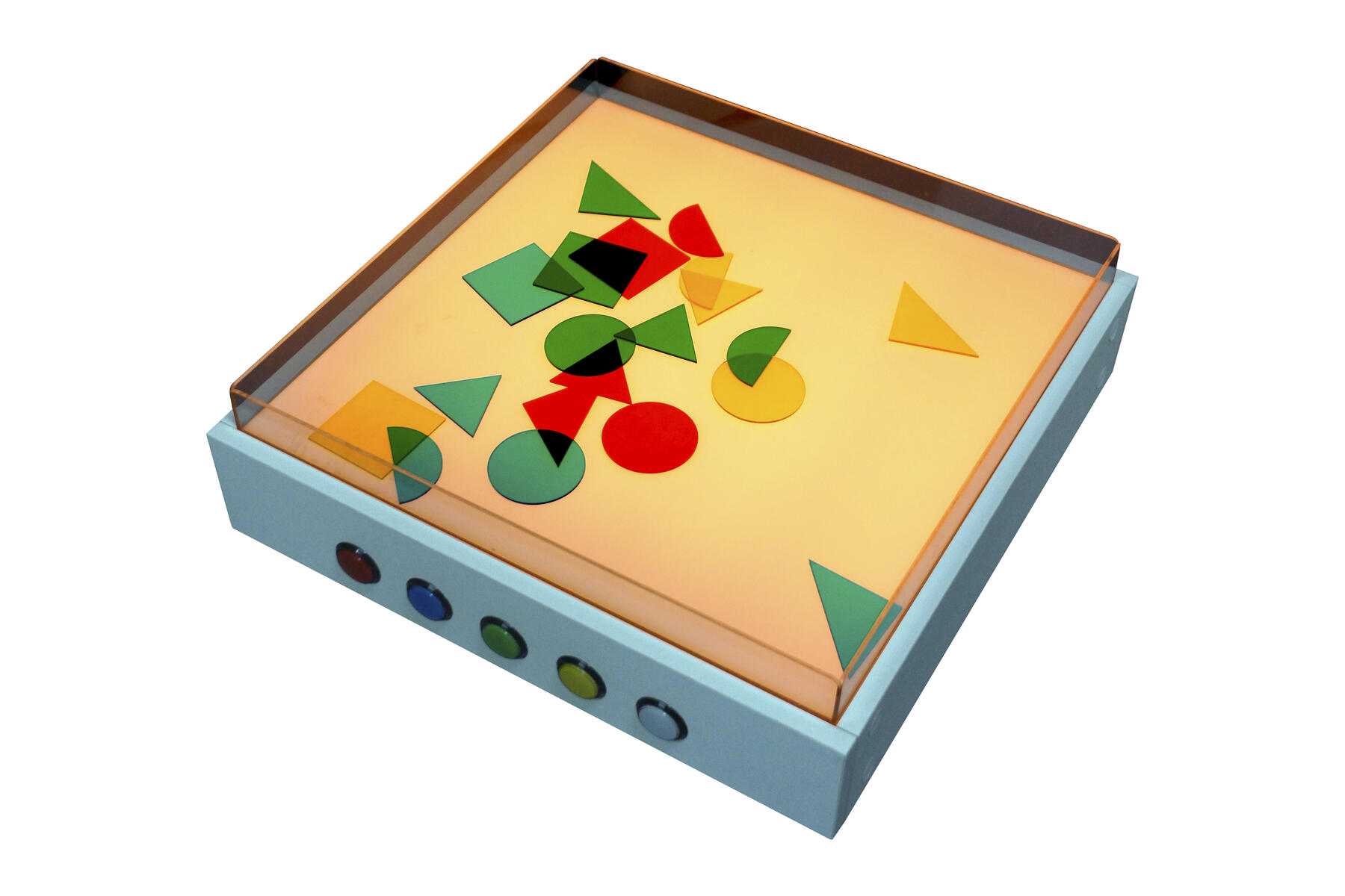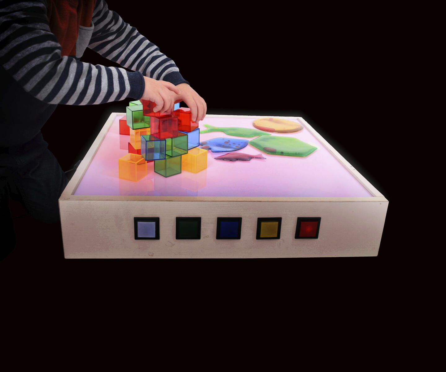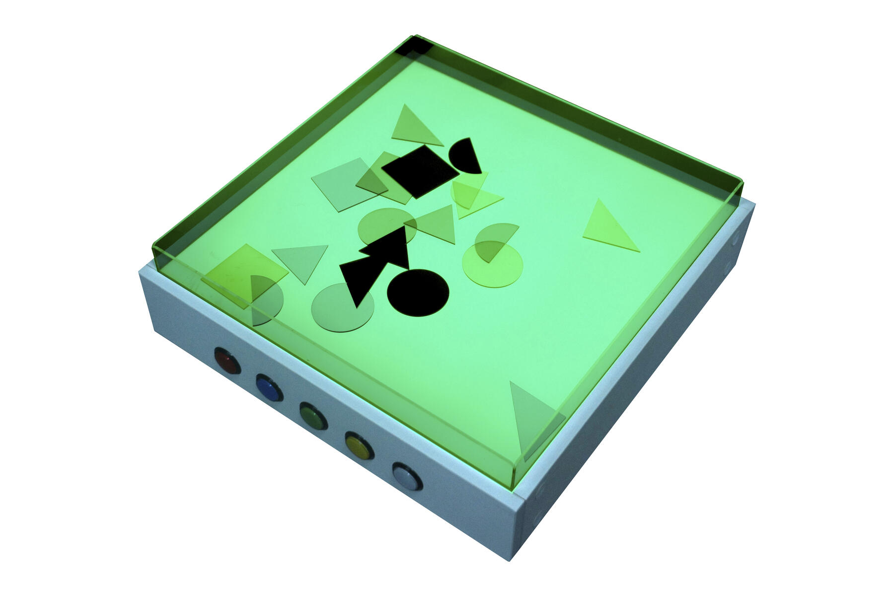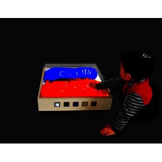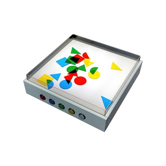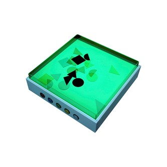 Ett stabilt ljusbord med ett smart plasttråg för sand och kladdig lek. Ljusbordet kan användas på ett bord eller direkt på golvet. Det finns 6 stora knappar för att skifta färg vilket stimulerar sinnena och observationsförmågan. Plasttråget håller sand och kladdig lera/färg på plats vilket ger möjlighet till taktila och sensoriska upplevelser med ljus. Mått: 60x60x12 cm. 10,2 kg. Material: Akrylplast.