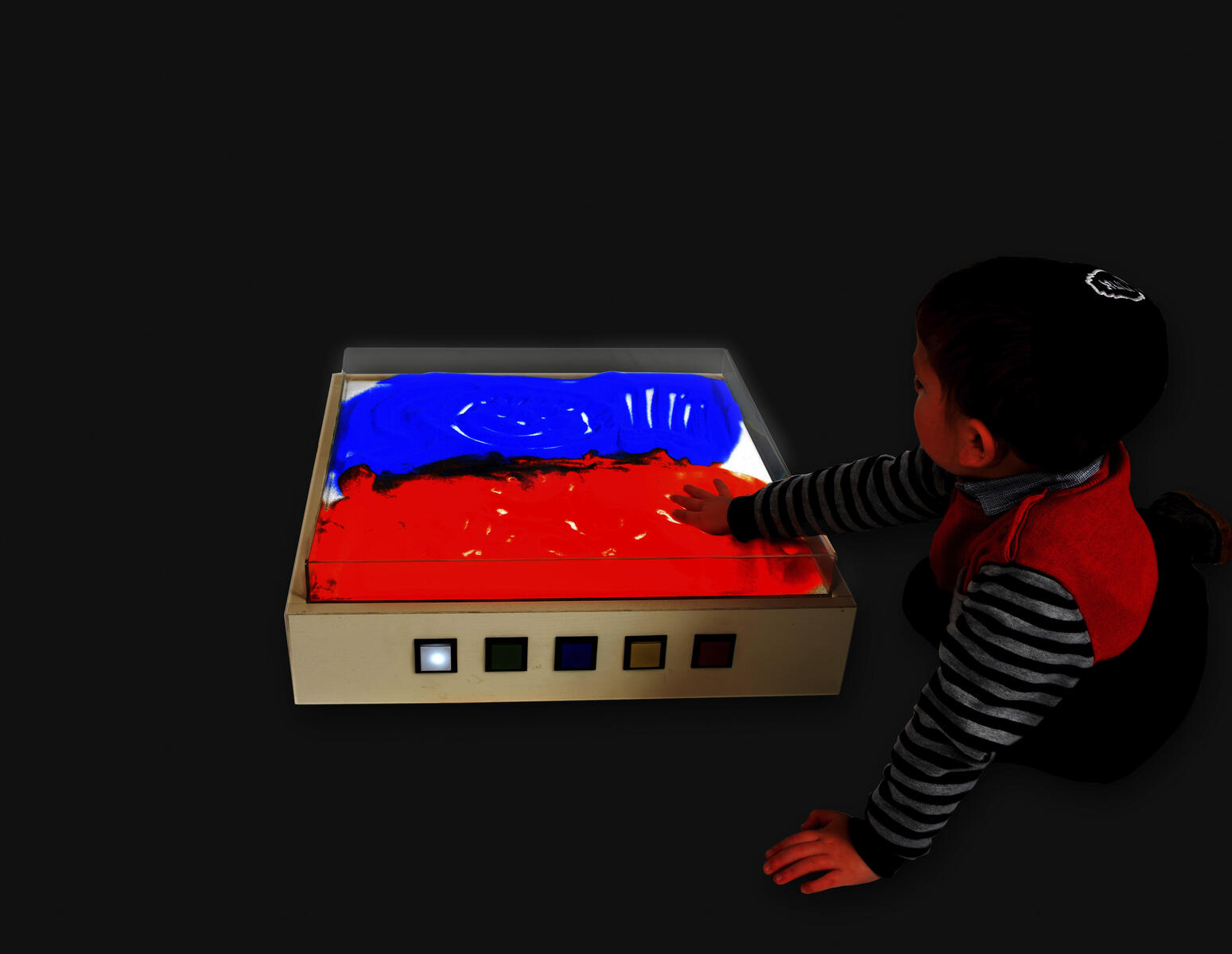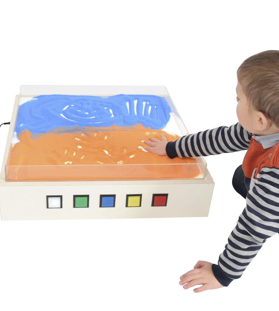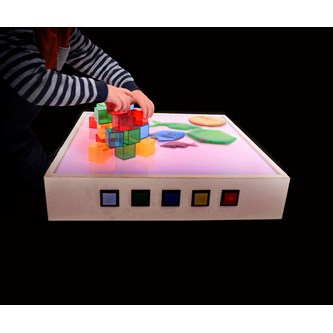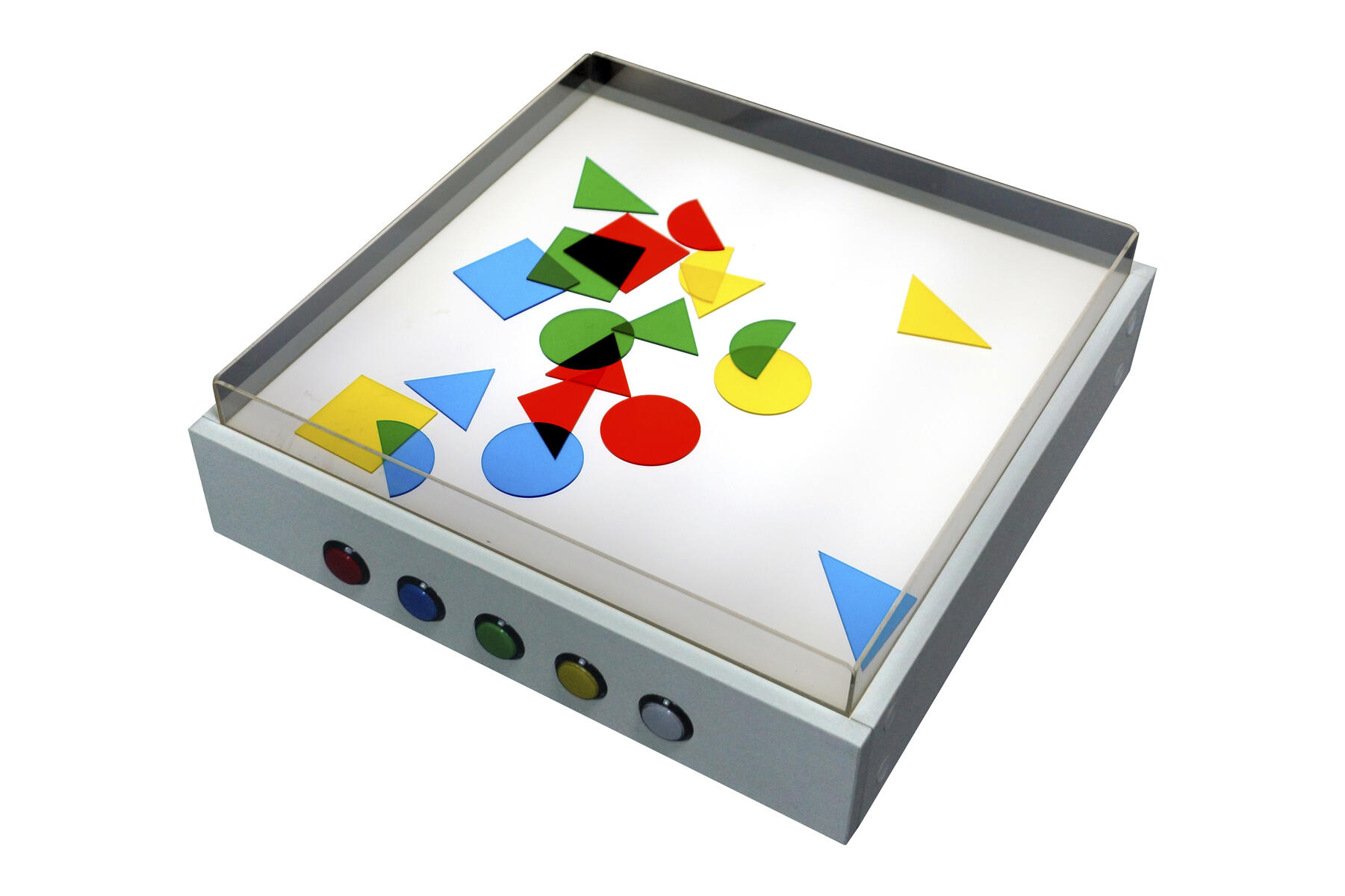 Ett stabilt ljusbord med ett smart plasttråg för sand och kladdig lek. Ljusbordet kan användas på ett bord eller direkt på golvet. Det finns 6 stora knappar för att skifta färg vilket stimulerar sinnena och observationsförmågan. Plasttråget håller sand och kladdig lera/färg på plats vilket ger möjlighet till taktila och sensoriska upplevelser med ljus. Mått: 60x60x12 cm. 10,2 kg. Material: Akrylplast.
