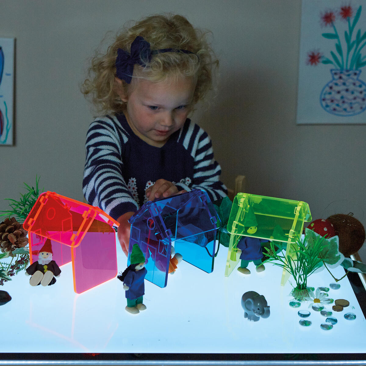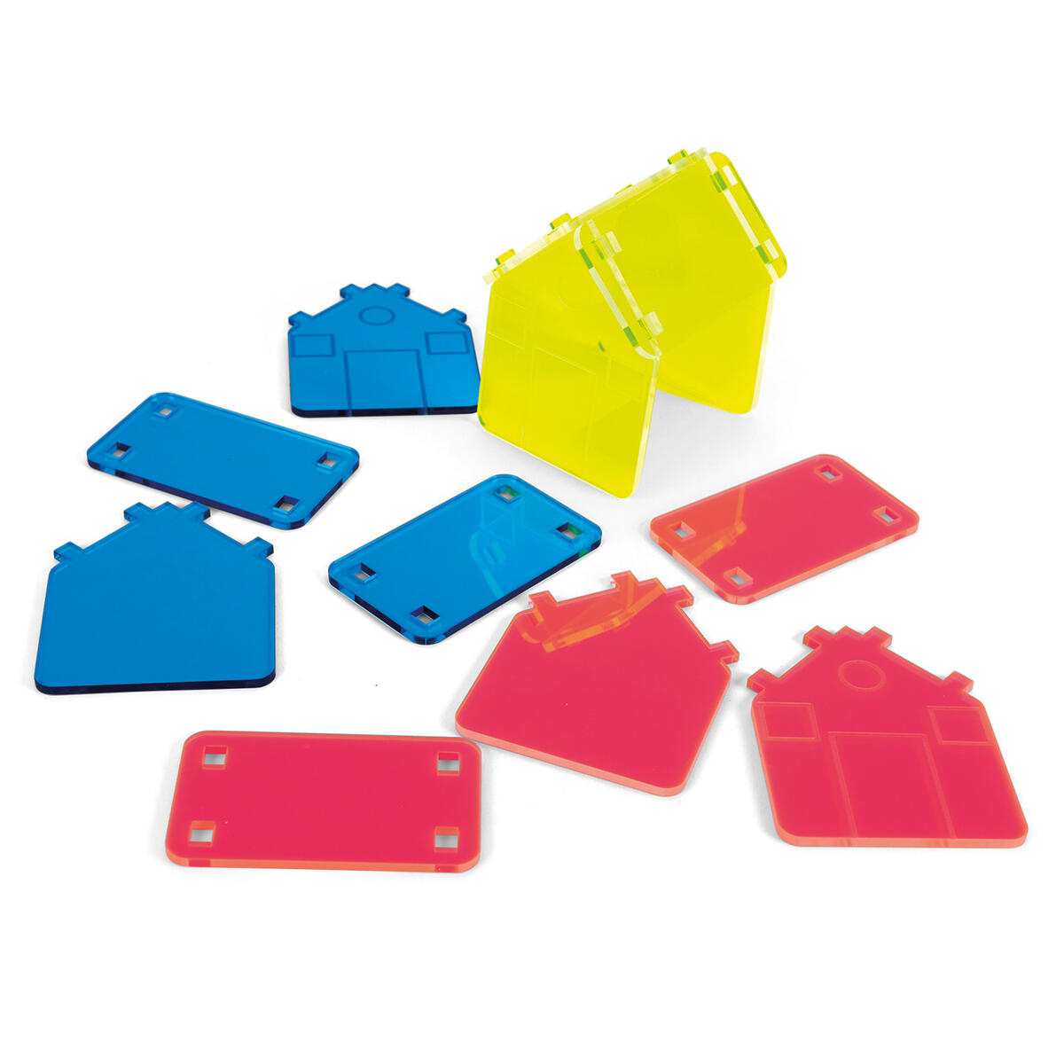 Husdelar för tre hus i akrylplast. Sätt ihop och bygg en egen miniatyrvärld med olika naturfynd. Placera husen på ett ljusbord för bästa effekt. Innehåller ett blått, ett gult och ett rosa hus. Från 3 år.