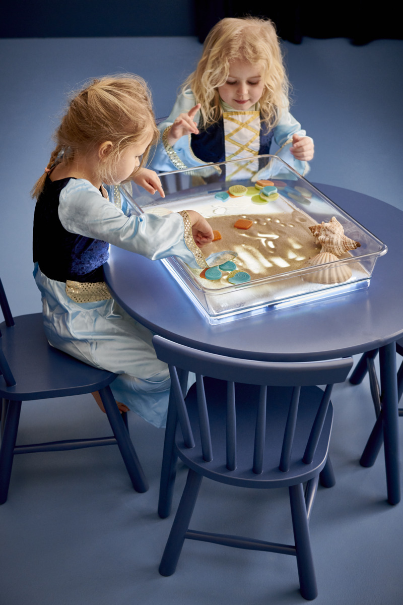 Ett stabilt ljusbord med ett smart plasttråg för sand och kladdig lek. Ljusbordet kan användas på ett bord eller direkt på golvet. Det finns 6 stora knappar för att skifta färg vilket stimulerar sinnena och observationsförmågan. Plasttråget håller sand och kladdig lera/färg på plats vilket ger möjlighet till taktila och sensoriska upplevelser med ljus. Mått: 60x60x12 cm. 10,2 kg. Material: Akrylplast.