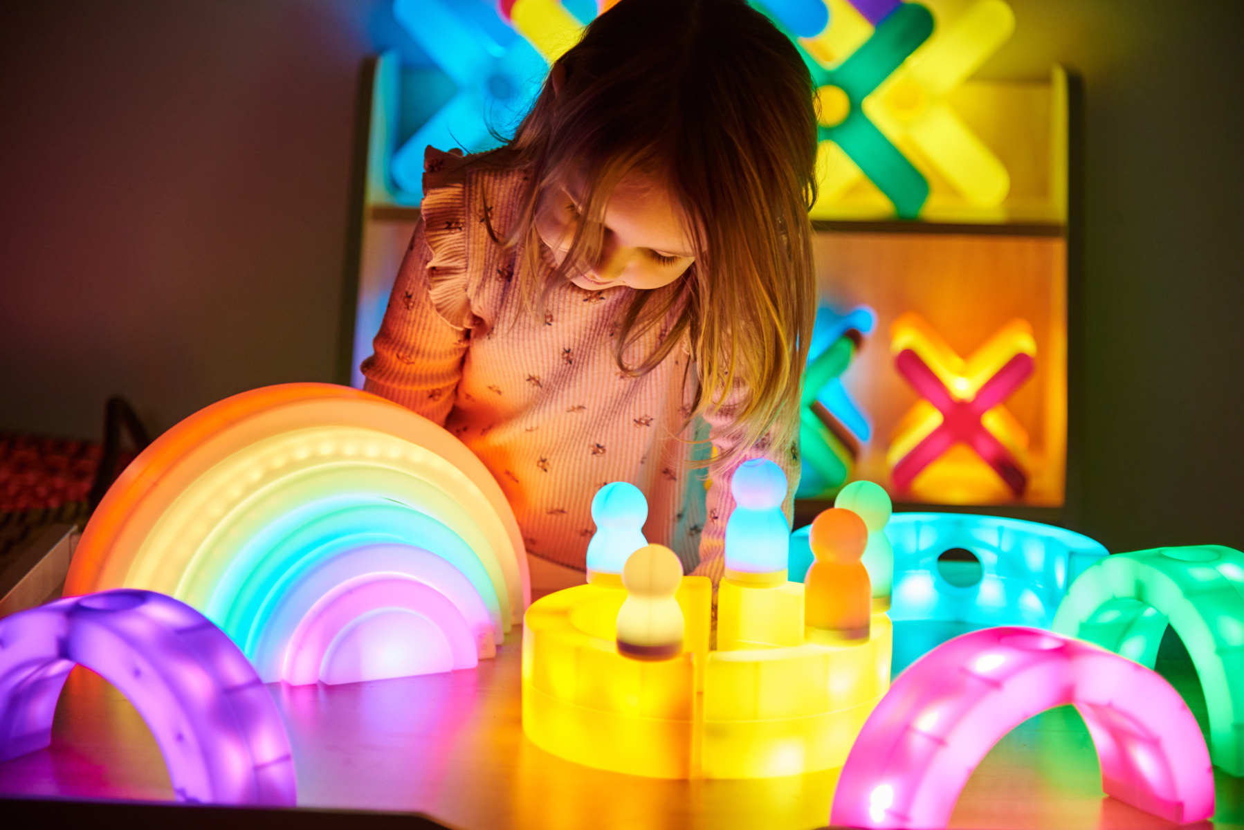 12 st. Sensoriska, lysande och färgglada bågar. Bygg och skapa i mörkret för en helt ny sensorisk upplevelse. Blir fulladdade efter 2 timmar och lyser sedan i 4 timmar. Laddas via medföljande USB-kablar. Mått: B22xH11xD7 cm. Två av varje färg: röd, orange, gul, grön, blå och lila. Av ABS-plast. Från 10 månader.