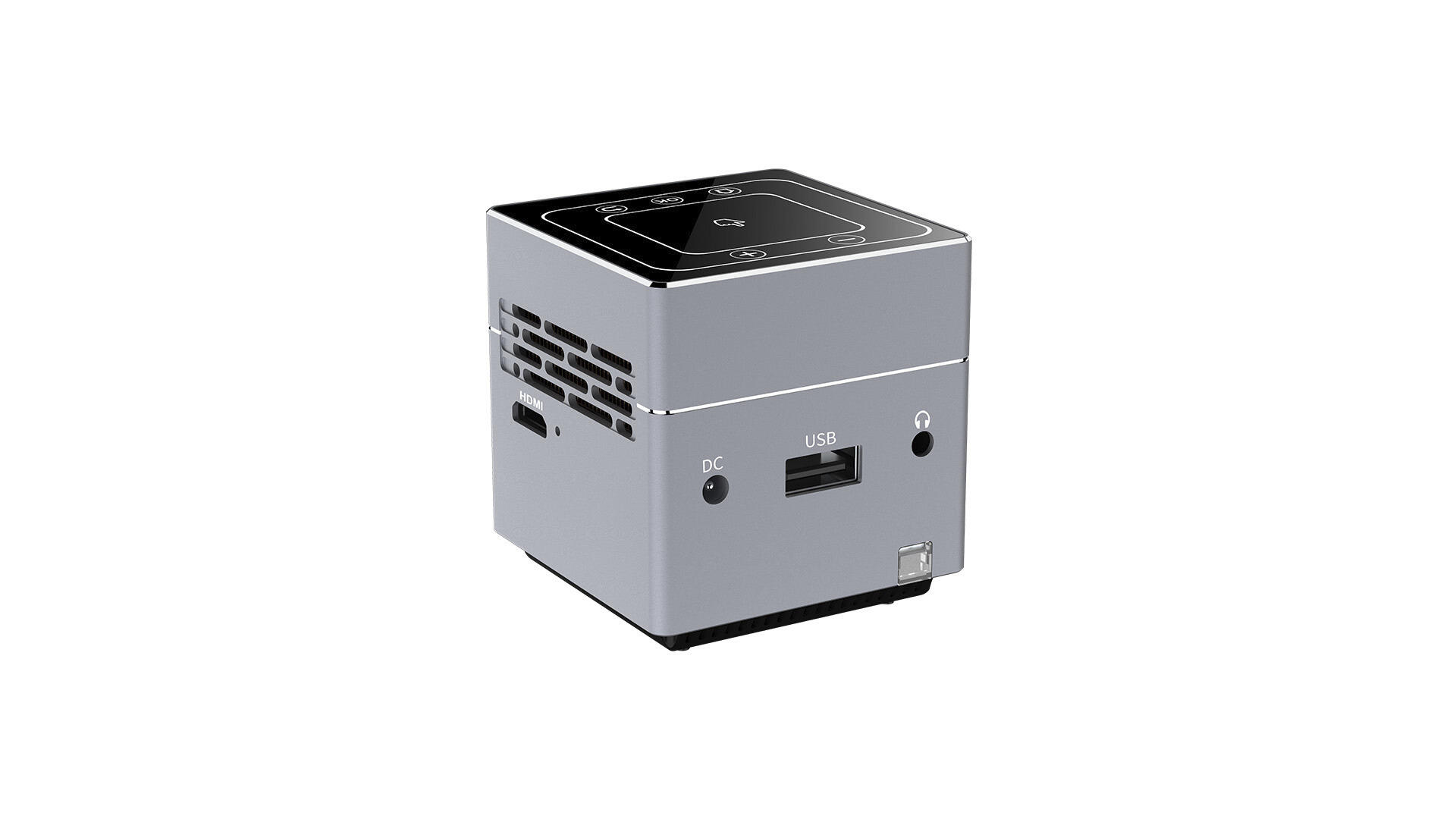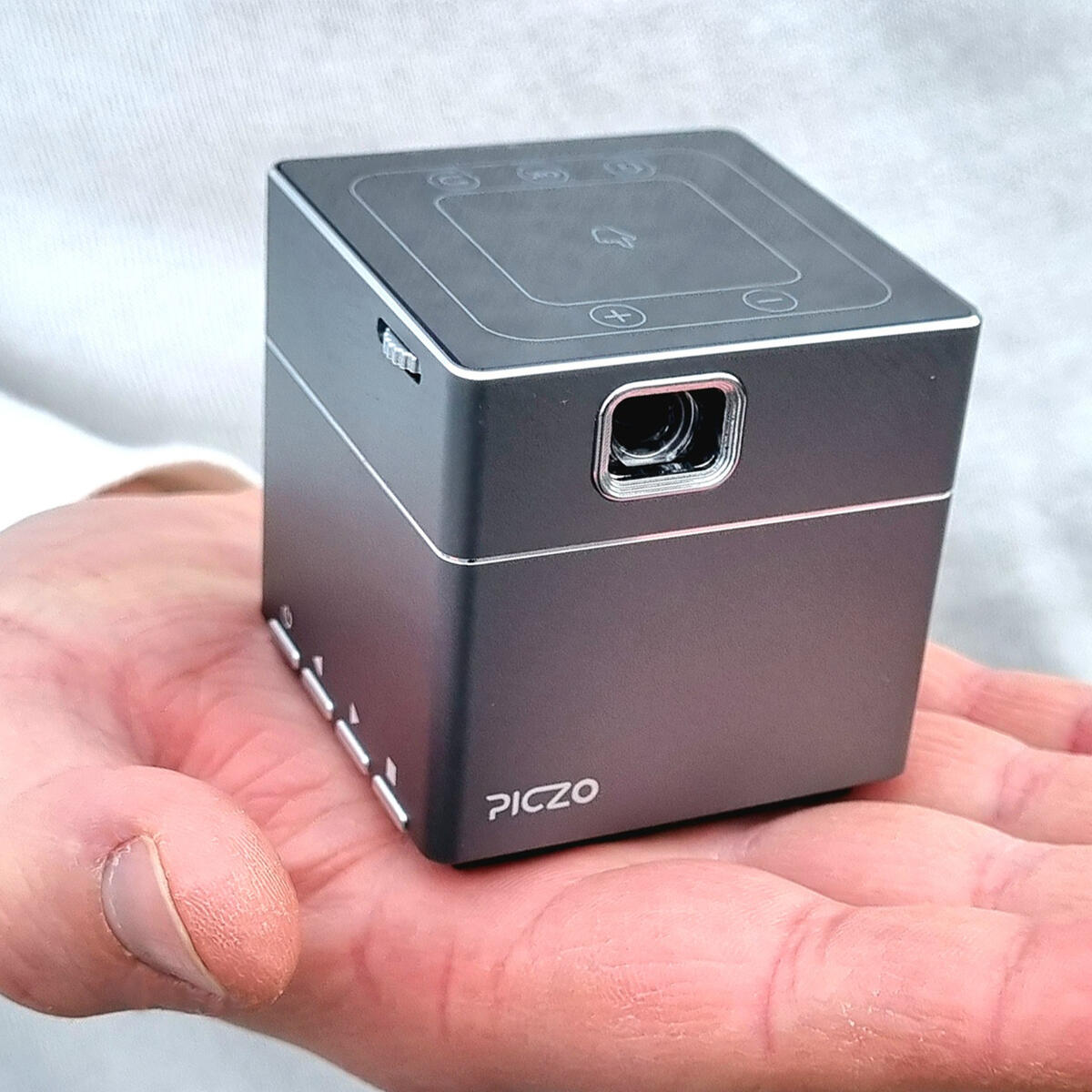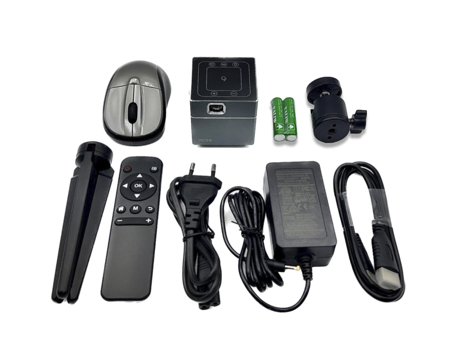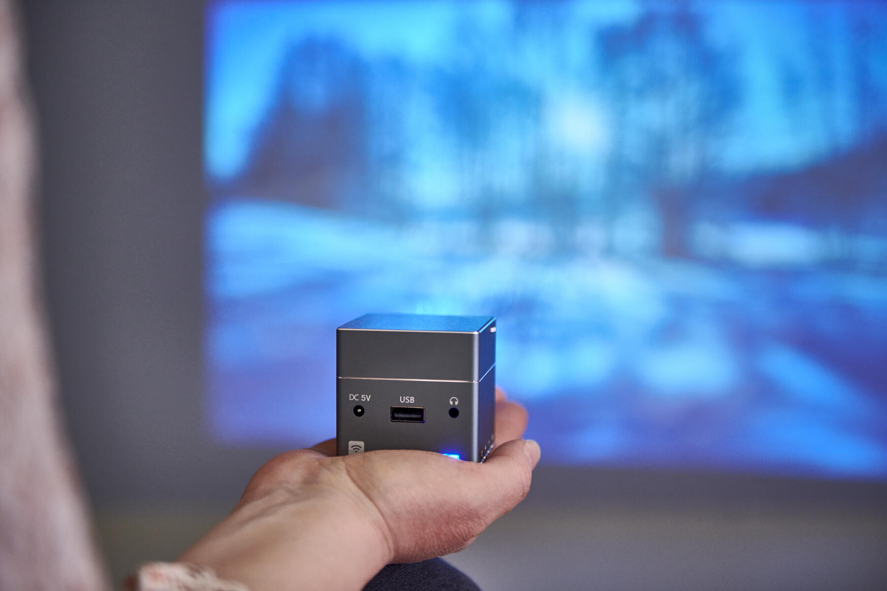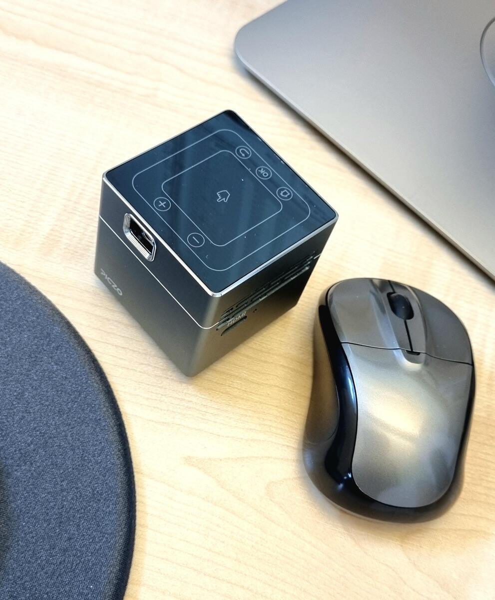150 ANSI lumen. En extremt kompakt projektor som får plats i handflatan eller i fickan. Projicera bilder och video trådlöst på vilken yta som helst, inomhus eller utomhus; projektorn har full HD och är utformad för optimal rörlighet. Styr via fjärrkontroll eller direkt på projektorn. 30 000 timmars livslängd på LED-lampan och inbyggt batteri med två timmars batteritid. 1 mini HDMI-ingång, hörlursutgång AUX, USB-uttag. Innehåller: projektor, strömkablar, fjärrkontroll, tripodstativ och en trådlös mus. Mått: 55x55x55 mm, vikt 180 gram.