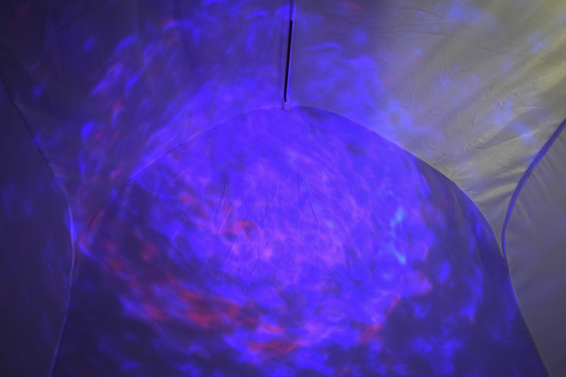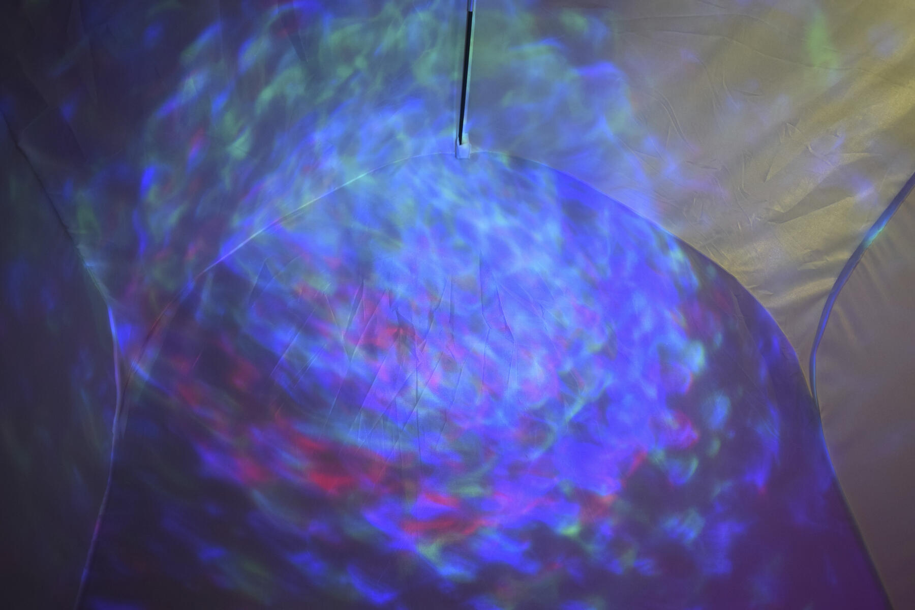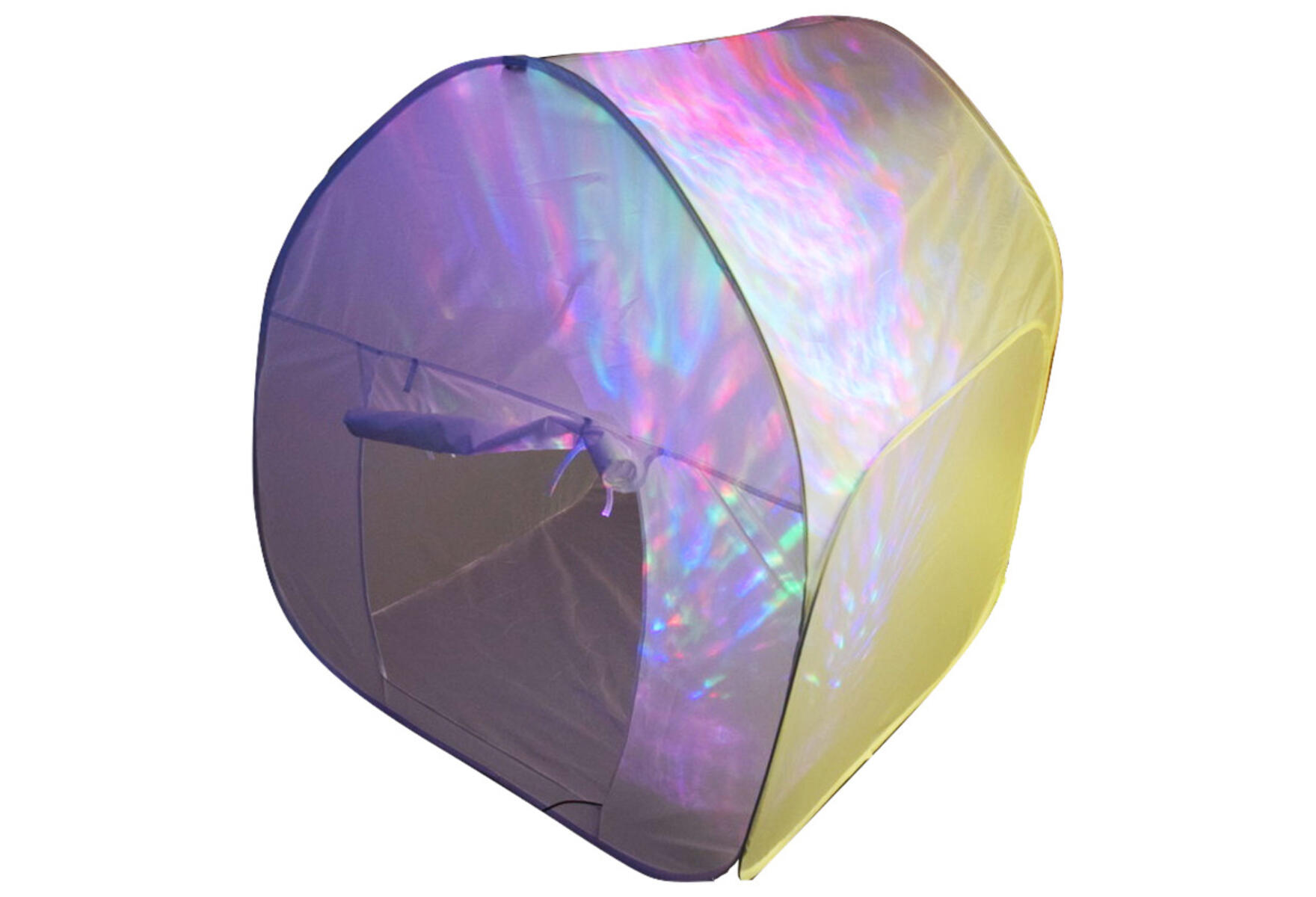 Ett flexibelt sätt att bygga upp ett rum för sinnena där du kan projicera vad du vill på väggar och tak. Det är dessutom lätt tillgängligt även om man sitter i t.ex. rullstol. Här kan man slappna av, inhämta energi eller utforska något. I varje hörn finns möjligheter att hänga upp saker för ytterligare stimulans. En förvaringsväska ingår.Mått: 142x142x142 cm. PVC-fri. Från 10 månader.