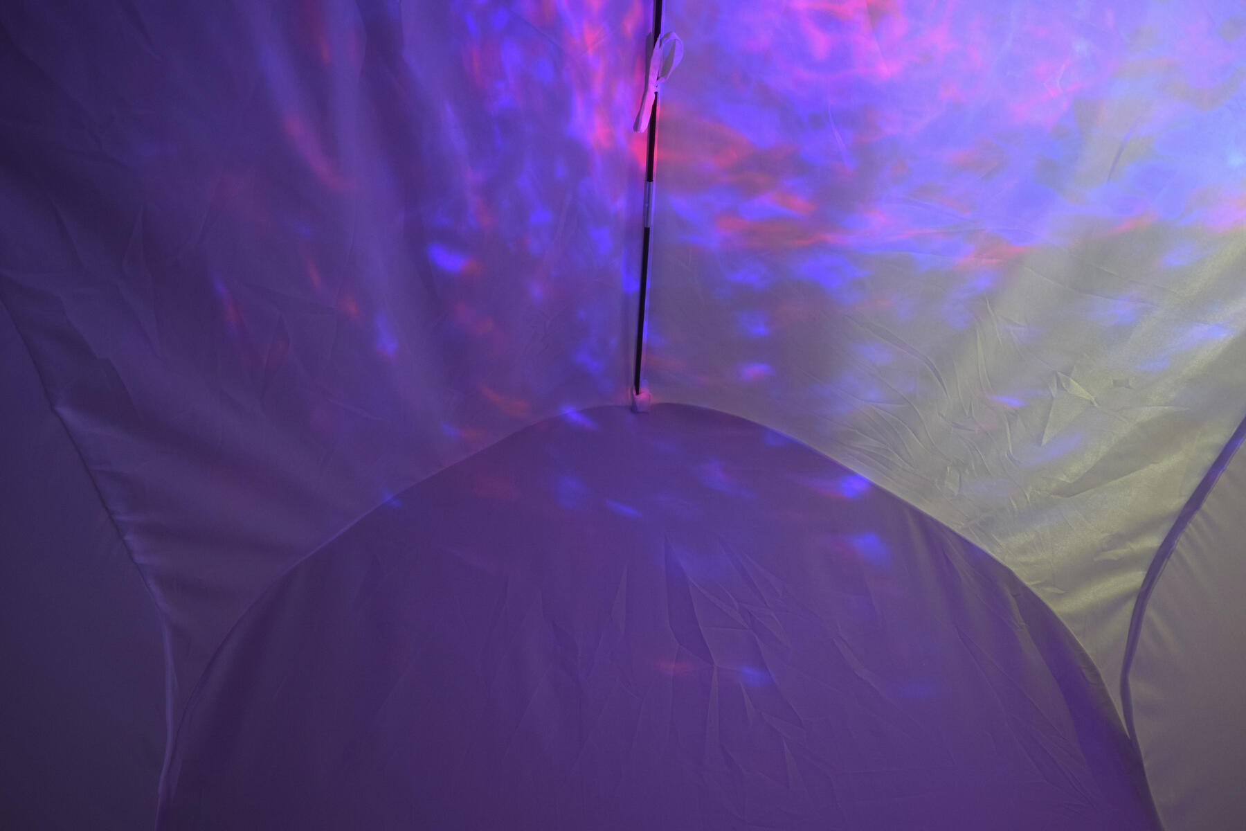 Tältet blir ett rum där du kan projicera runtomkring de som sitter i det. Ljus skiner genom duken och tältet kan användas även för att skapa lugn och ro. Mått: 105x105x110 cm. Material: polyester. PVC-fri.