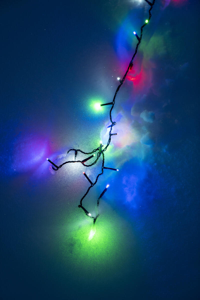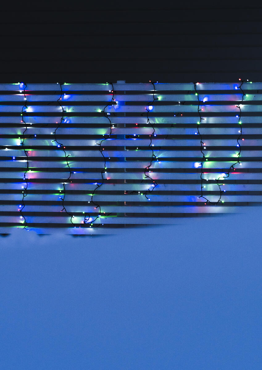 Lågvolts ljusslinga för inom- och utomhusbruk. 96 RGB (flerfärgade) lysdioder som kan växla mellan konstant, blinkande eller svepande ljus i olika färger. Lampor ej utbytbara. Transformator med inbyggd färgväxlare ingår. Mått: 5 cm mellan dioder, slingans längd 4,8+4 m till kontakt. Testad enligt IP44. CE-märkt.