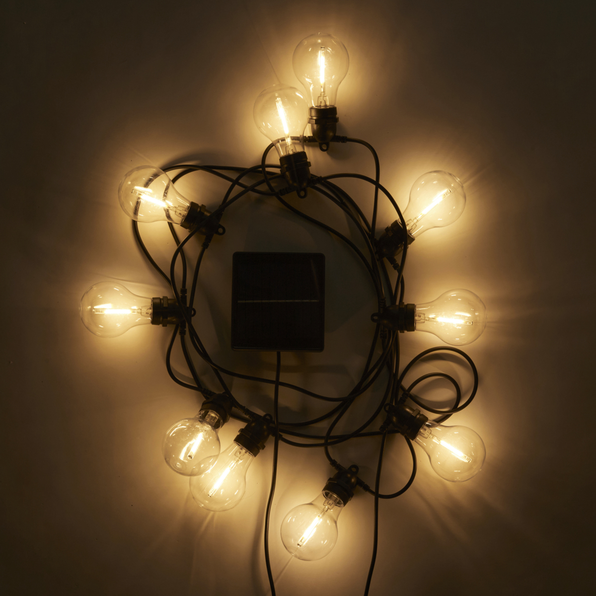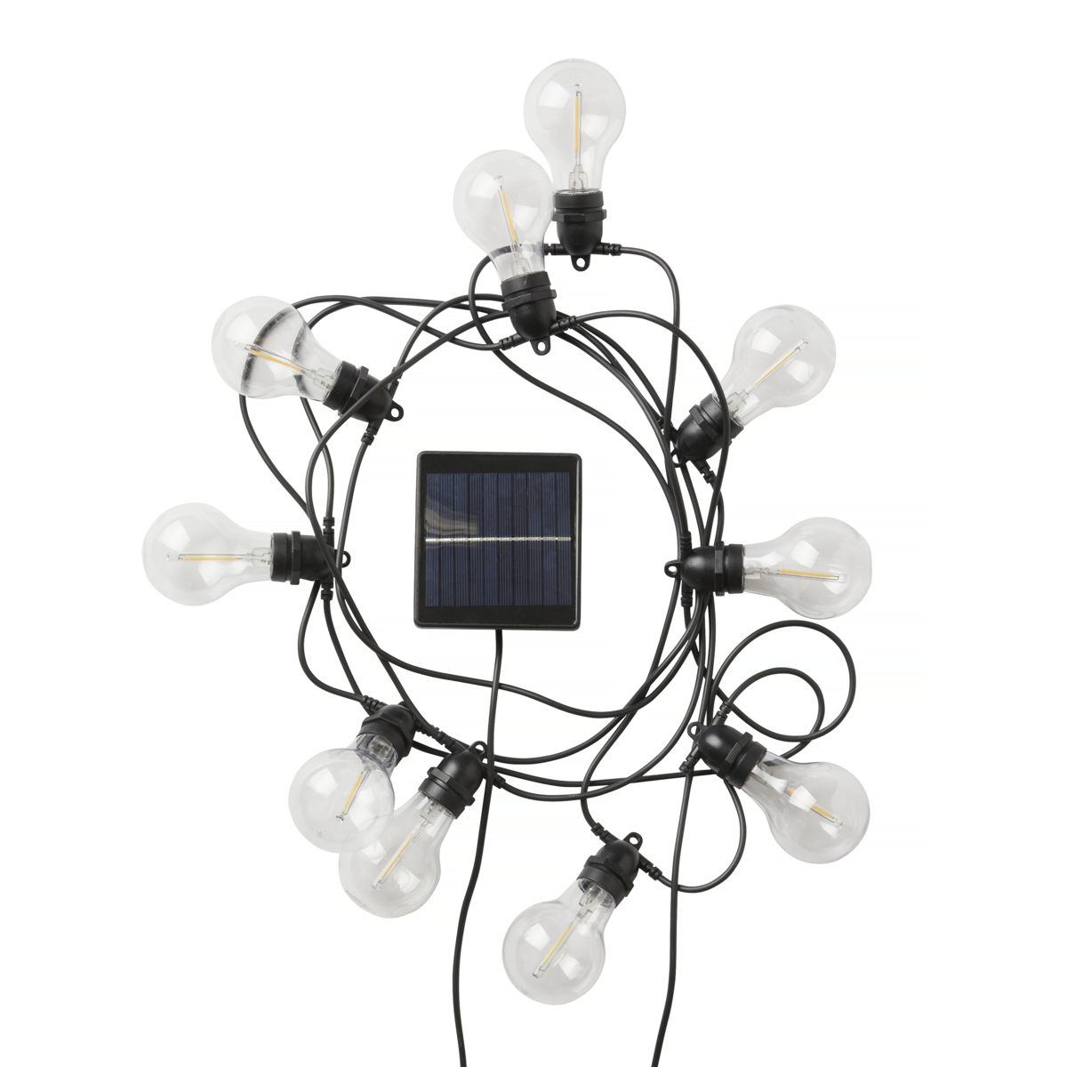 Solcellsdriven svart ljusslinga med 10 lampor i plast med LED-ljus i. Ljuset lyser varmvitt. IP44. 3 m sladd. Solcellspanelen är 102x95 mm med litiumbatteri.