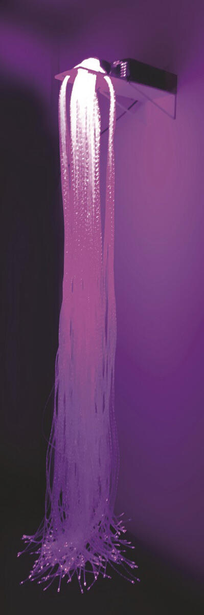 Fästs på väggen så att de lysande trådarna hänger ner på ett säkert vis som en kaskad eller ett tält. Fiberoptikduschar används för avslappning i kombination med lugn musik eller sagoläsning. Mått: 47x16x10 cm.