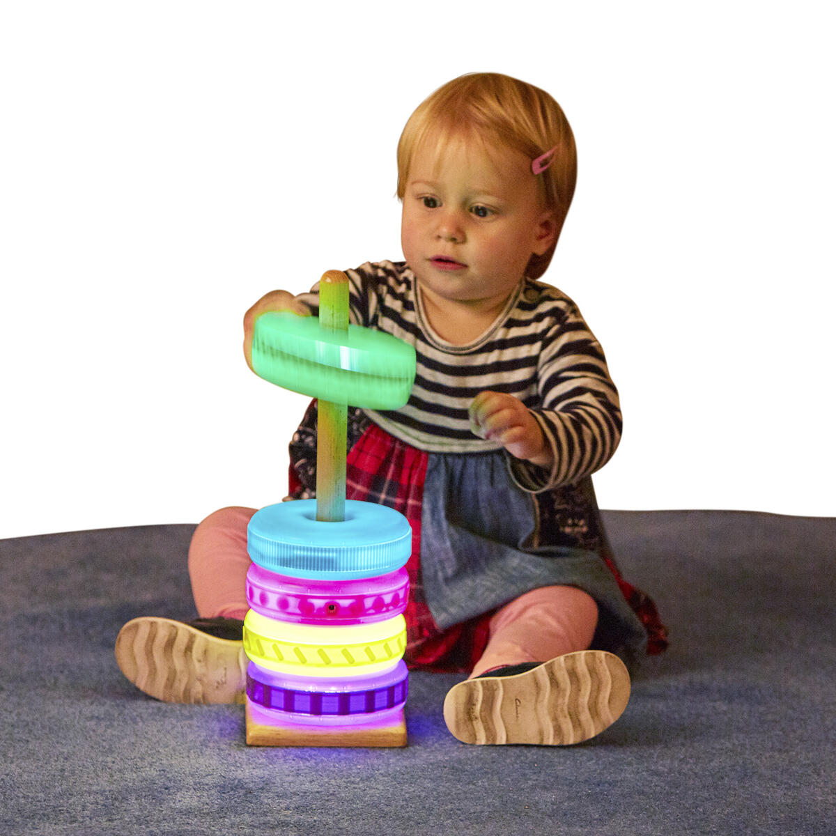 Använd dessa lysande ringar att bygga med. Ladda alla 5 ringar i medföljande dockningsstation så lyser de i 1 min när man skakar dem. Varje ring har olika textur på utsidan vilket är spännande att känna på. Pinnen som syns på bilderna kan köpas separat på artnr 130467. Ringarna mäter 15 cm i diameter och är 4 cm tjocka. Av ABS med silikonhölje. Dockningsstation i ABS. PVC-fri. Från 10 månader.
