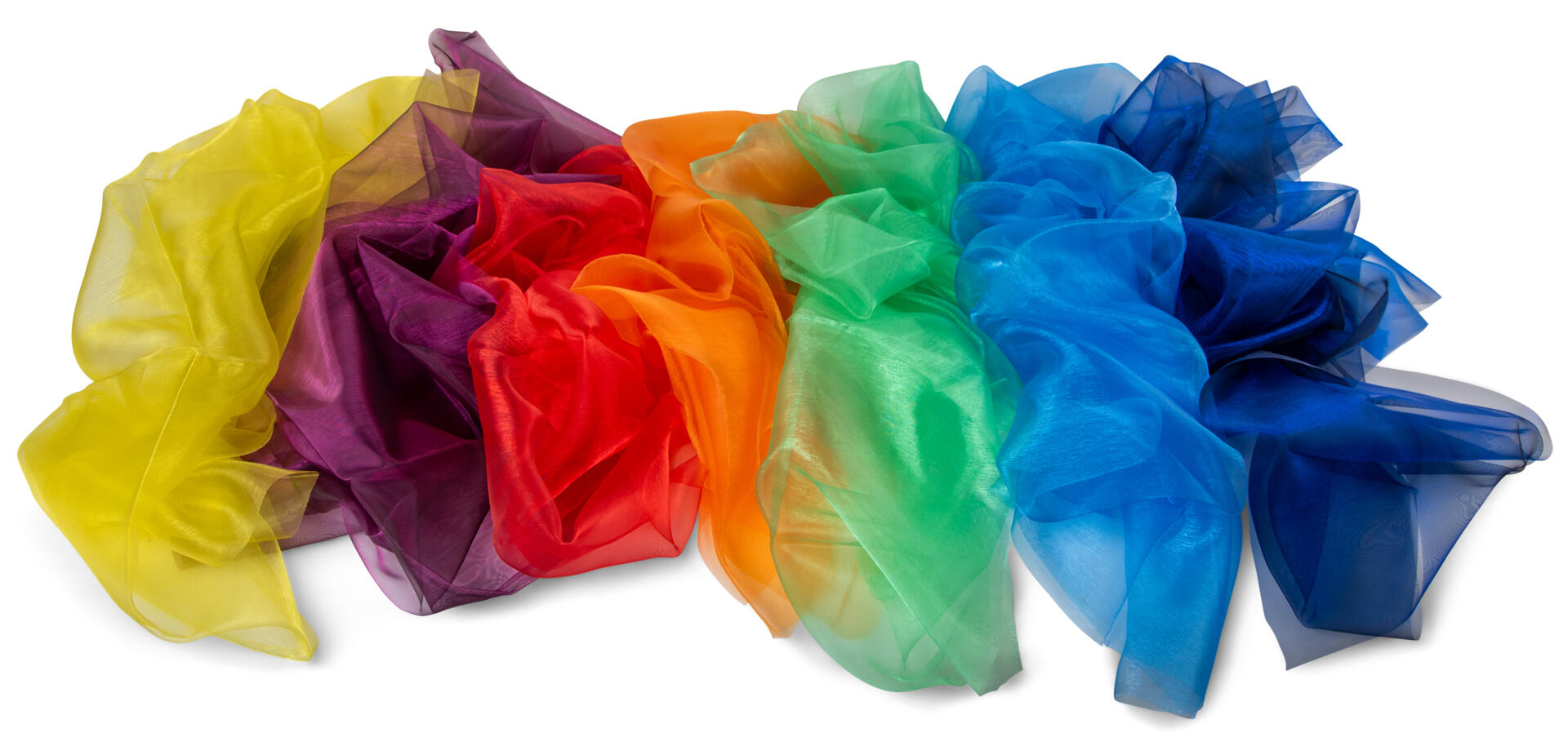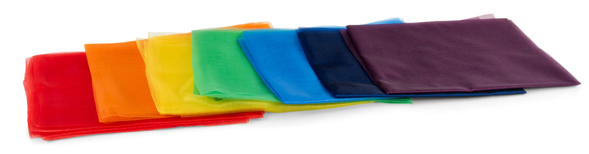 Vackert, glansigt organzatyg i regnbågens sju färger. Används t.ex. till att skapa visuella effekter, till musik och rörelse eller för att skapa en mysig miljö. Innehåller 7 olika färger. PVC-fri.