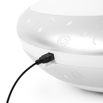 Den stora snurran låter och byter mellan olika färger när den snurras. Ljuset är i mjuka färger och skapar mönster på väggarna. Förutom att vara lugnande och få barnen fokuserade så är den också bra för motoriken. Både ljus och ljud kan stängas av. Uppladdningsbar. Höjd 38 cm, ø 37 cm. Material: ABS. PVC-fri. Från 10 månader.