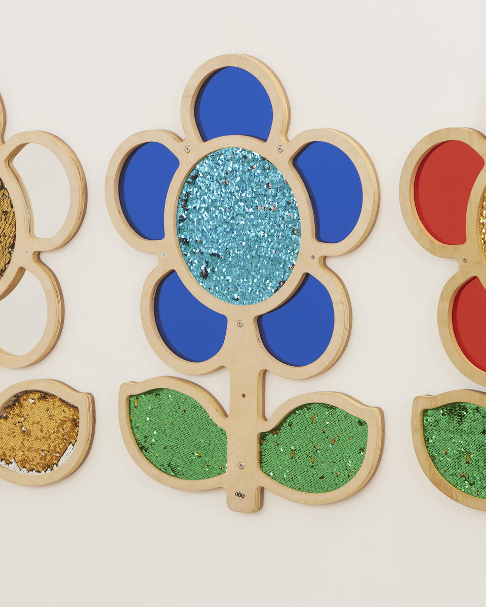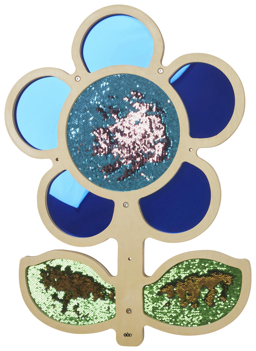 En blomma som blir en härlig dekoration i ett rum. Den drar fokus till sig och uppmuntrar både till att vända på paljetterna i mitten och att spegla sig i blombladen. Blomman passar väldigt bra i ett sinnesrum. Mått: B55xH77 cm. Material: Trä, akryl, PET, polyester. PVC-fri. Från 3 år.