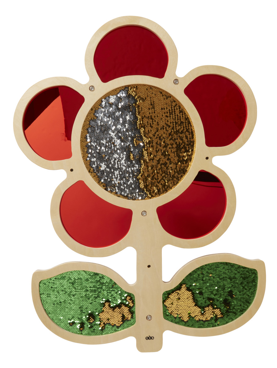 En blomma som blir en härlig dekoration i ett rum. Den drar fokus till sig och uppmuntrar både till att vända på paljetterna i mitten och att spegla sig i blombladen. Blomman passar väldigt bra i ett sinnesrum. Mått: B55xH77 cm. Material: Trä, akryl, PET, polyester. PVC-fri. Från 3 år.