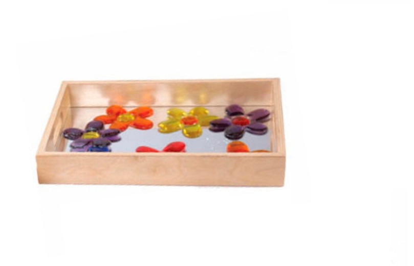 Ett hjälpmedel för att förstå reflektion, mönster och geometri. Barnen kan t.ex. bygga på varsin sida om spegeln och förklara för varandra hur de byggt, eller bygga upp små miljöer som reflekteras i speglarna. Mittdelen är avtagbar vilket ökar användningsmöjligheterna ytterligare. Byggklossar ingår ej. Av FSC-märkt plywood och spegel av akrylplast. PVC-fri.