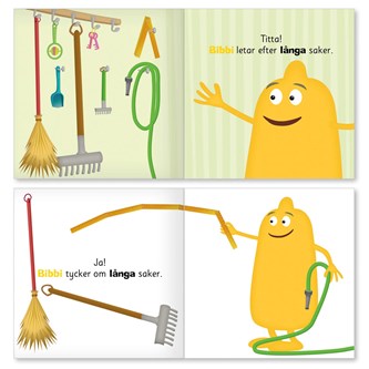 Hjälp Bobbo att hitta röda saker eller Bibbi att hitta långa saker! Passar perfekt för den som vill bygga ordförråd och fokusera lite extra på beskrivande ord. Färdigtryckta flanobilder. Sagotexten är på svenska och med teckenstöd/TAKK. Av FSC-märkt papper. PVC-fri.
