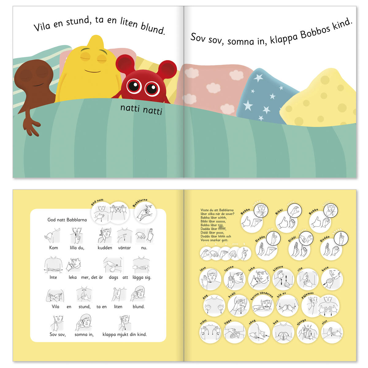Kom lilla du, kudden väntar. Det är kväll och dags att sluta läsa, leka, klättra och busa. Babblarna kryper ner i sängen en efter en, och barnet hjälper till att natta dem. Texten i boken baseras på Babblarnas vaggvisa, så det går också bra att sjunga bokens text om man vill. Babblarnas nattningsritual ger plats för barnet att gissa, fylla i och att själv natta figurerna. Sen är det dags att somna själv också förstås. Natti natti, god natt och sov gott. I bokens sista uppslag finns det teckenillustrationer så att man lätt kan lära sig att läsa boken med tecken också. 44 sidor, 20x20 cm.