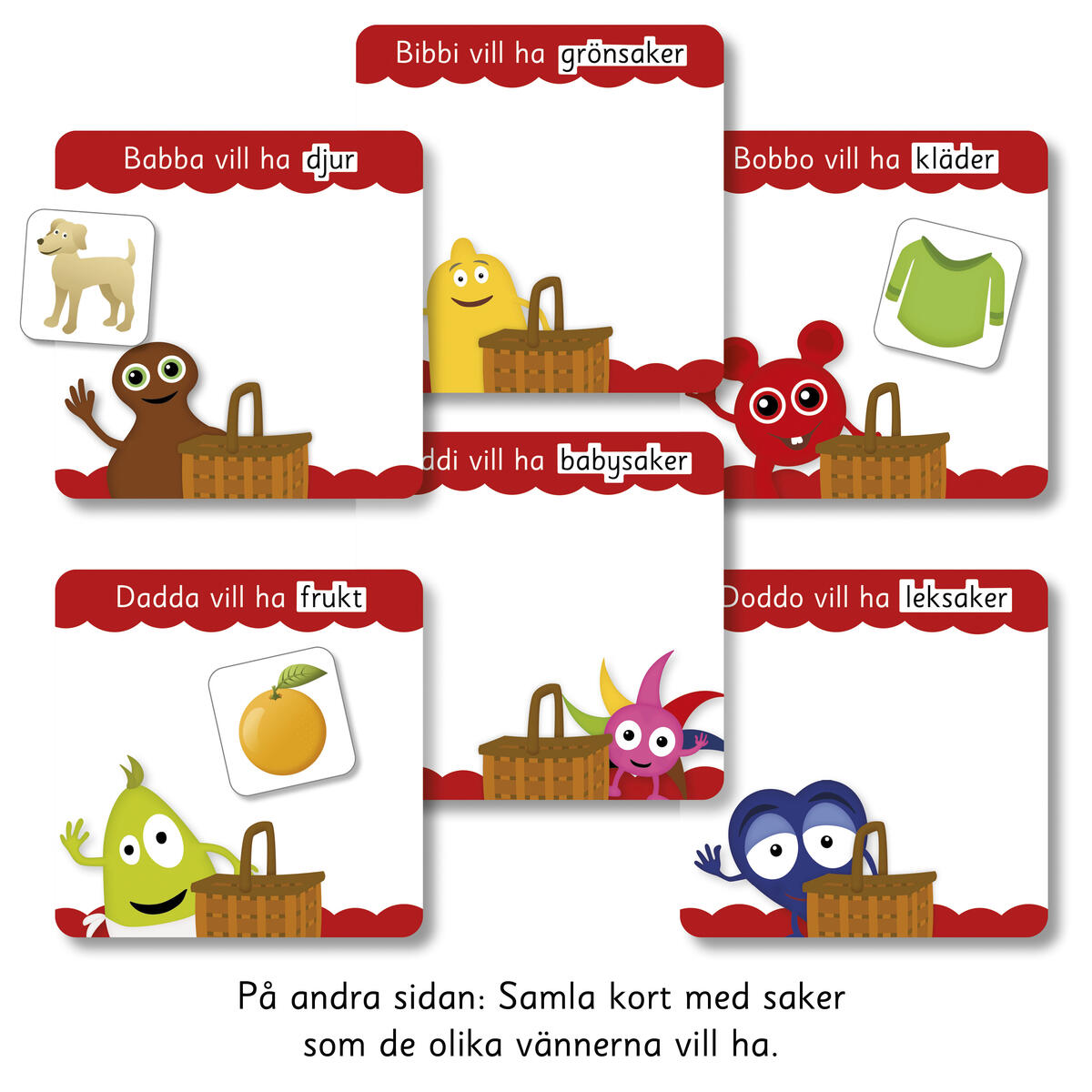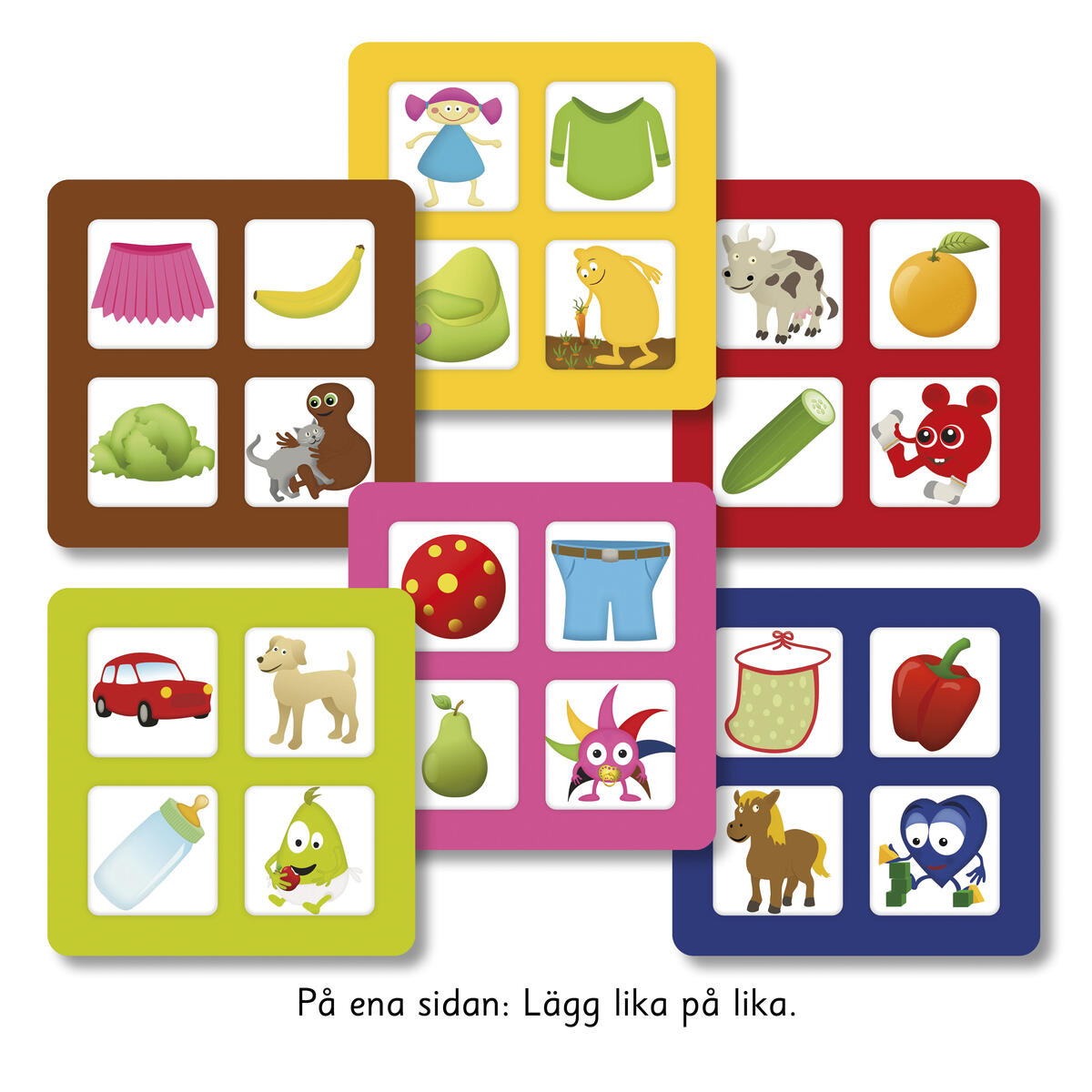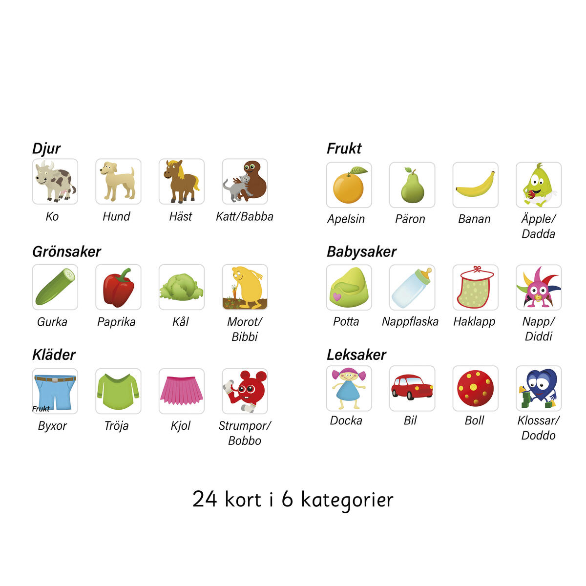 Bildkorten passar för att samla på brickorna på två olika sätt: lika på lika eller para ihop verktyget med vad Babblarna gör. Spelet bygger upp ordförrådet, ger övning på att sätta ihop flera ord till meningar, leker med minnet och ger möjlighet att sortera sakerna i kategorier. Innehåll: 6 dubbelsidiga brickor och 24 kort. PVC-fri.