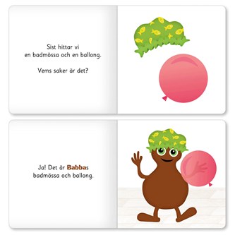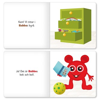 Kartongbok i stort format. I Babbas byrå finns massor av saker. Men vems är alla saker? Hjälp Babba att dela ut sakerna till sina vänner. Boken I Babbas byrå fokuserar särskilt på begreppet ”Vems?” men också på de små men viktiga vokal- och konsonantskillnaderna i Babblarnas namn. Längst bak finns teckenillustrationer för orden i boken. 34 sidor, med giftfritt papper i tjock och tålig kartong, mått 24x24 cm. PVC-fri.