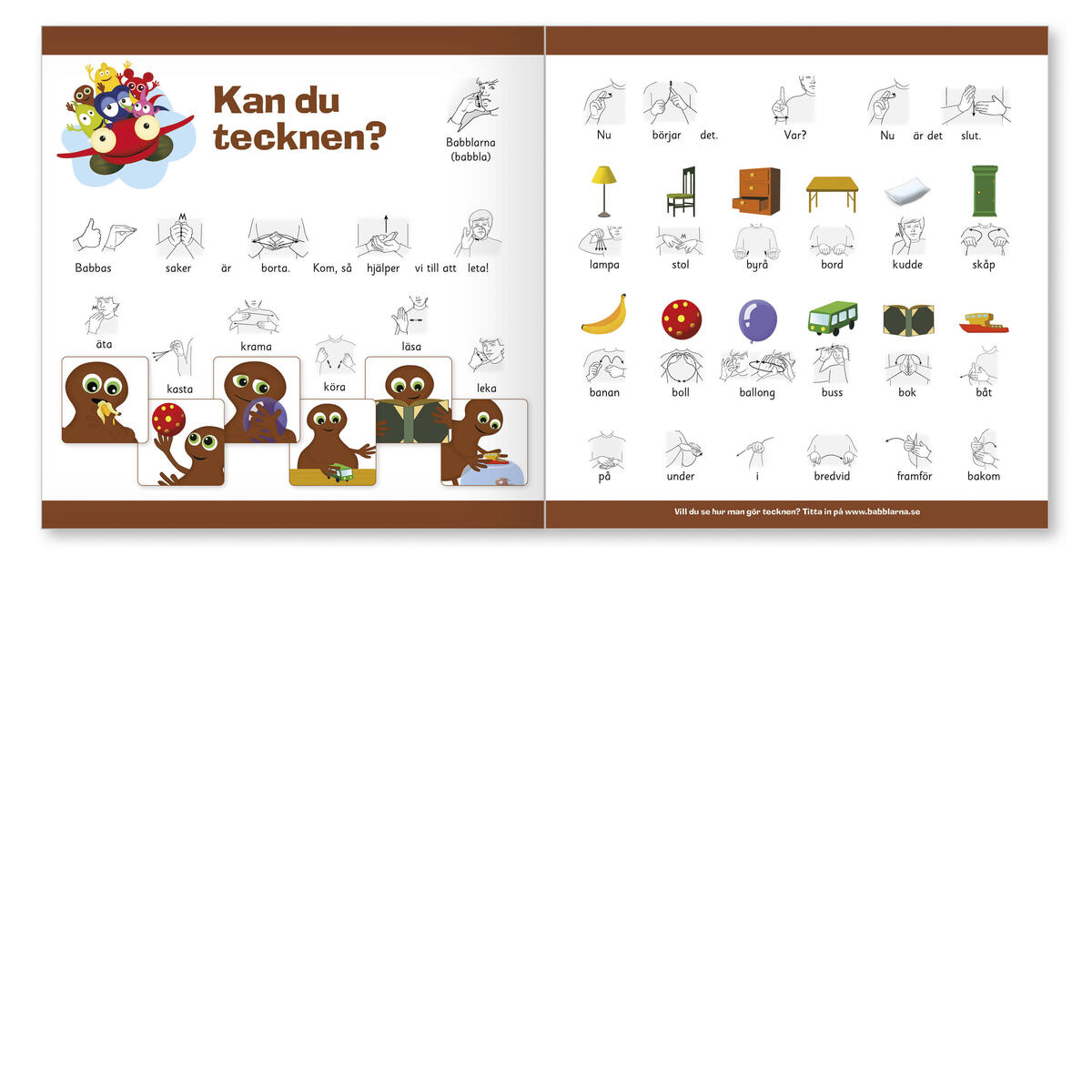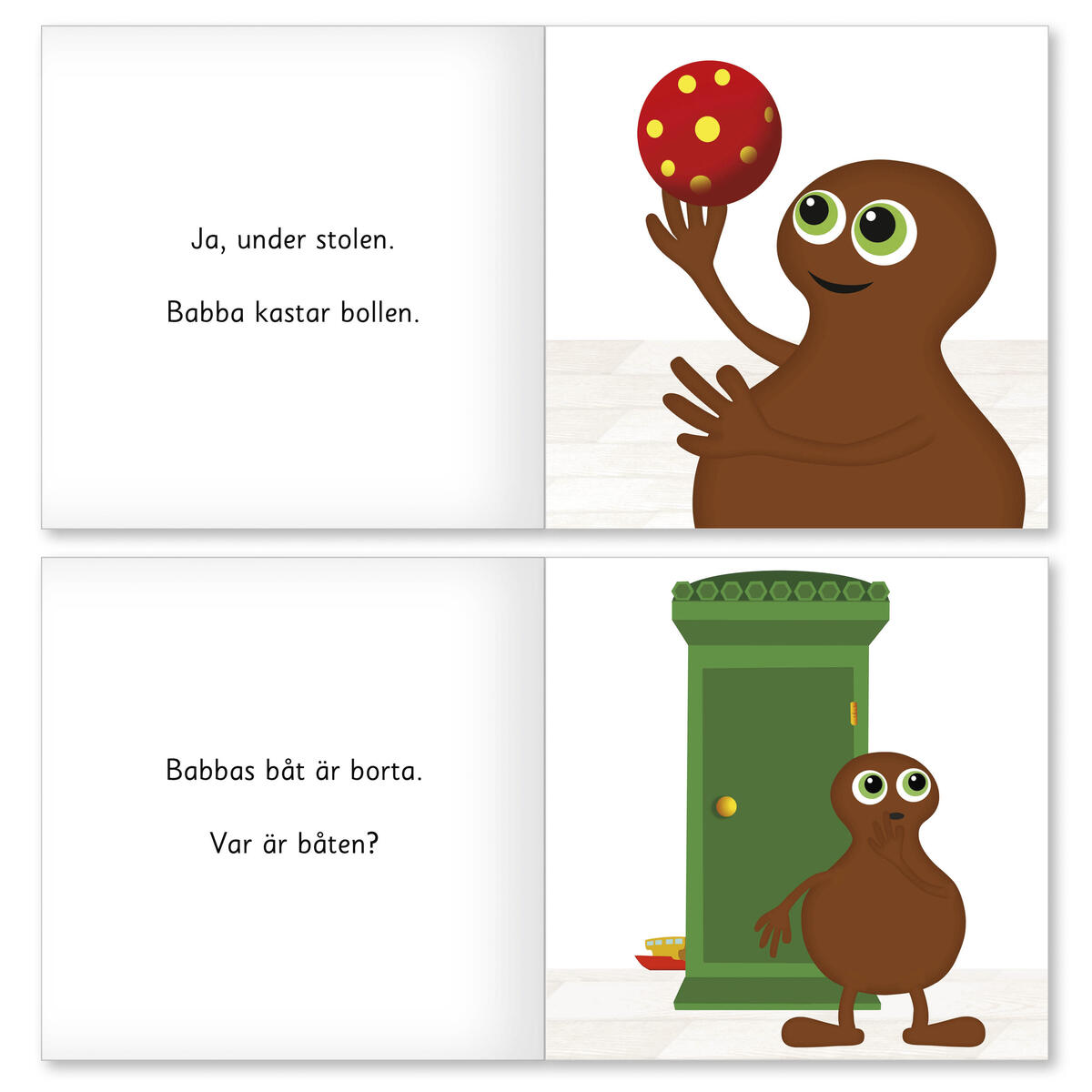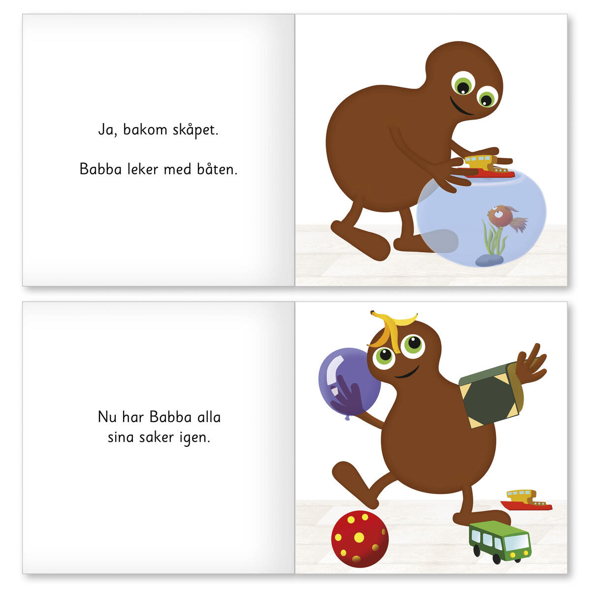34 sidor. Babba har tappat bort sina saker och vi får tillsammans hjälpa till att hitta dem. Boken fokuserar särskilt på frågan "Var?". Längst bak finns teckenillustrationer för orden i boken. Mått: 20x20 cm. Av FSC-märkt papper. PVC-fri.