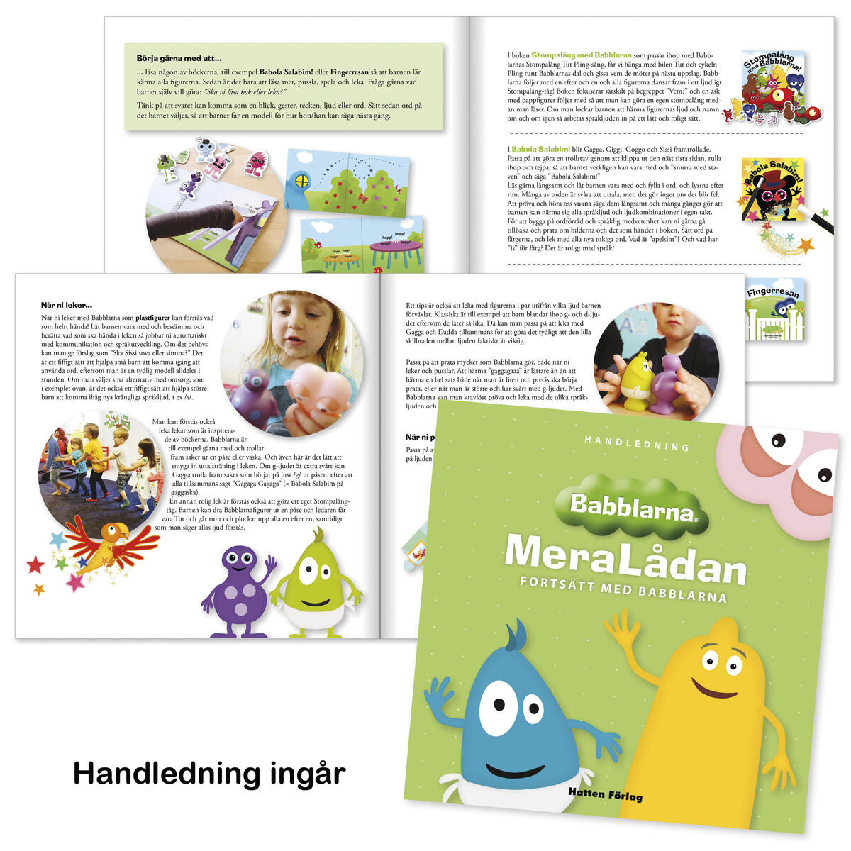 Nu fortsätter språkleken i Babblarnas värld! Här finns sådant som passar extra bra för den som vill fortsätta arbeta med Babblarna. MeraLådan innehåller tre böcker - Stompalång, Fingerresan och Babola Salabim! - plastfigurerna Gagga, Giggi, Goggo, Sassa, Sissi och Sosso samt ett memospel och ett träpussel med tolv bitar. Lättsam handledning ingår och en praktisk låda att förvara hela materialet i. För att arbeta strukturerat med språkträning med barn i behov av extra stöd för sin språkutveckling, så rekommenderar vi att komplettera paketet med boken "Tal & språkträning i Babblarnas värld" av Iréne Johansson artnr 129608.