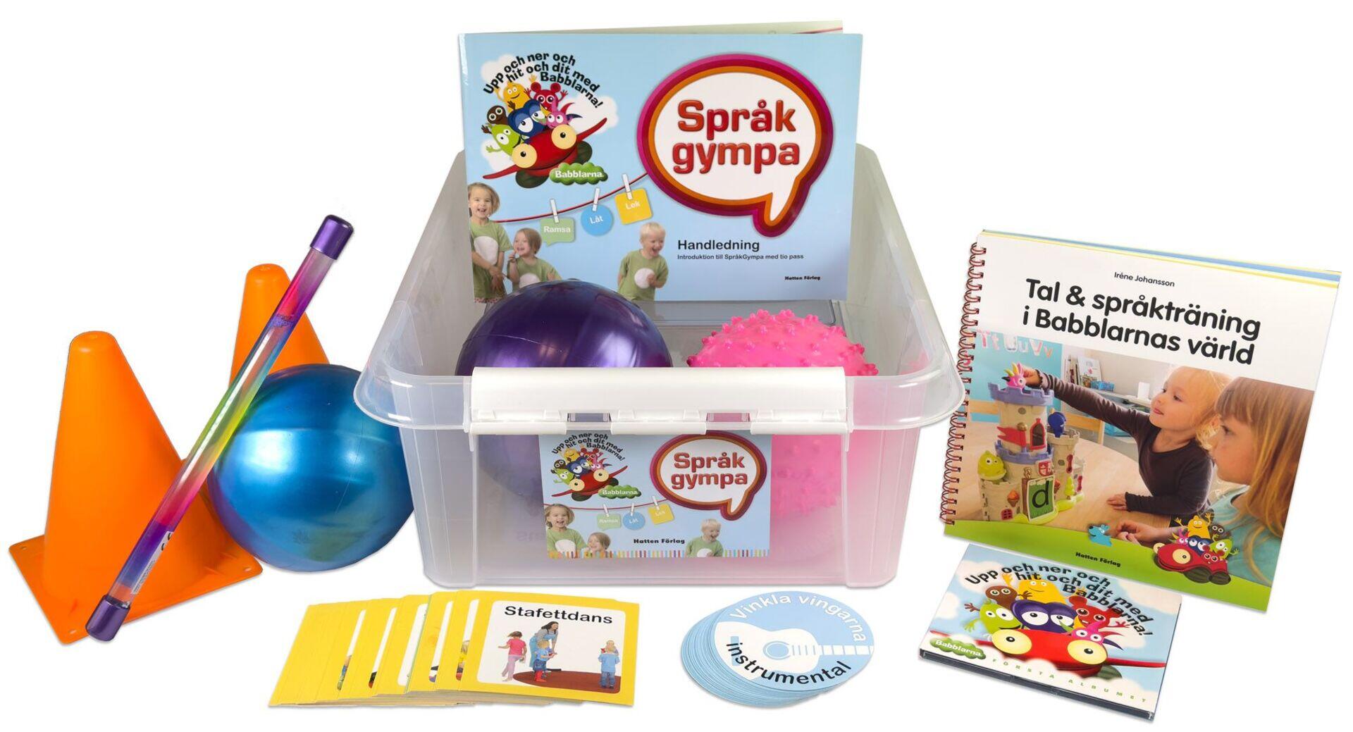 SpråkGympa-programmet ”Upp och ner och hit och dit med Babblarna” består av tio inspirerande, roliga, motoriska och språkutvecklande pass! Ett pass finns öppet på sprakgympa.se, de övriga nio passen kan du öppna när du beställer denna låda. Med ”Babblarna Första Albumet” som bas och många olika material som stöd, får hela barngruppen leka med ljud, språk och motorik. Ledarlådan innehåller allt du behöver: Tryckt handledning med tio pass, boken ”Tal- och Språkträning i Babblarnas värld” av Iréne Johansson (fördjupning), CD med musiken som ingår i programmet, kort med lekar (för att kunna sätta upp på väggen och komponera ihop egna pass), mapp med diverse material som används till de olika passen, trollstav, tre bollar, fyra koner, påse att gömma saker och kort i. Dessutom ingår inloggning till SpråkGympaWebben. Där finns instruktioner och inspirationsfilm till alla passen och musiken lätt tillgänglig. Allt förvaras i en praktisk plastlåda.