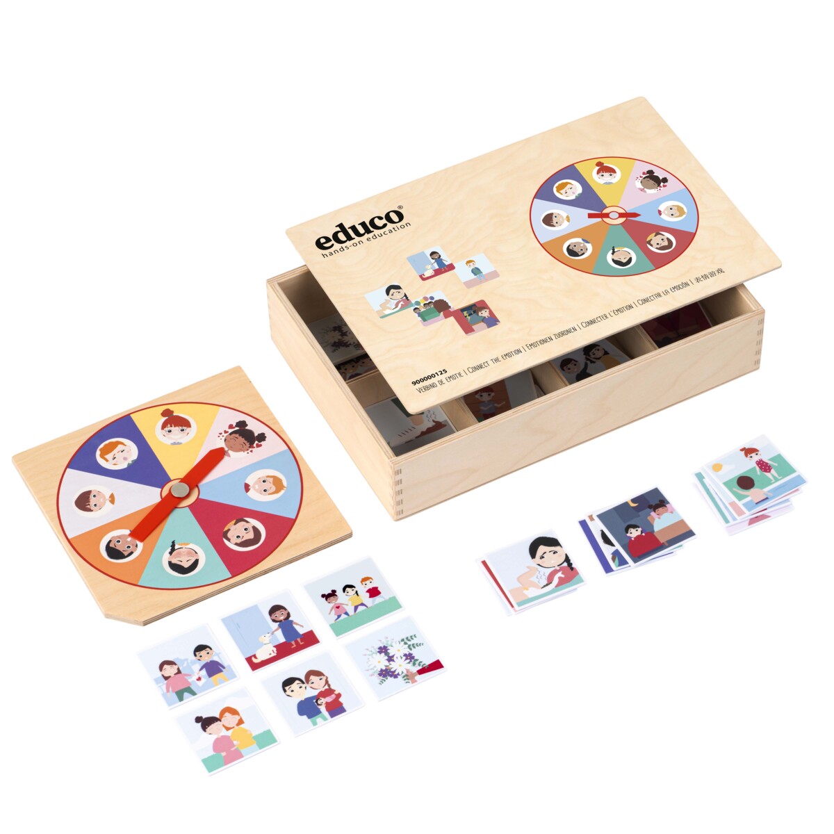 Spelbräde i trä med 8 känslor och en pil, 48 situationskort i plast, 8 plastkort med känslor. Material som kan användas på många olika sätt när man jobbar med känslor. Kan också användas som spel. Manual på engelska ingår. Mått: situationskort 5x5 cm, plastkort 5x5 cm, trälåda 33,5x22,5x7 cm. Från 3 år.