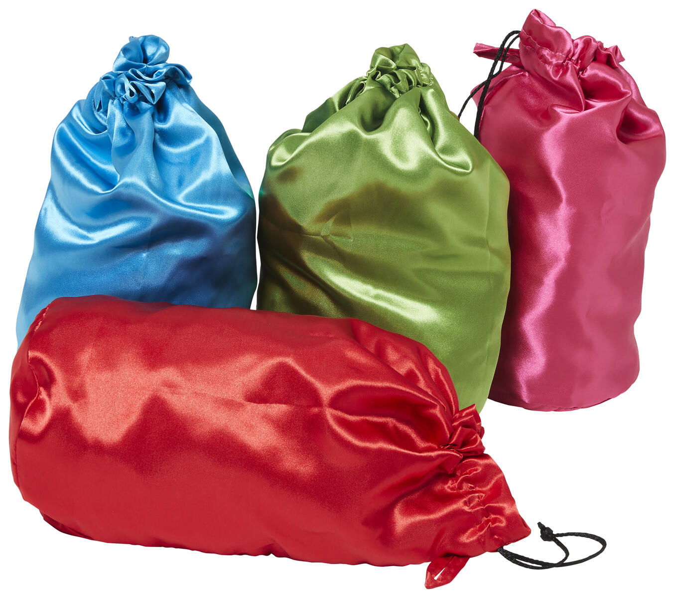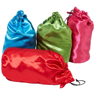 4 st/fp. Vackra påsar som kan användas till förvaring, språkpåsar, känsellekar m.m. Med snöre för återslutning. Blandade färger. Mått: omkrets 18, L34 cm. Av satin. Handtvätt.