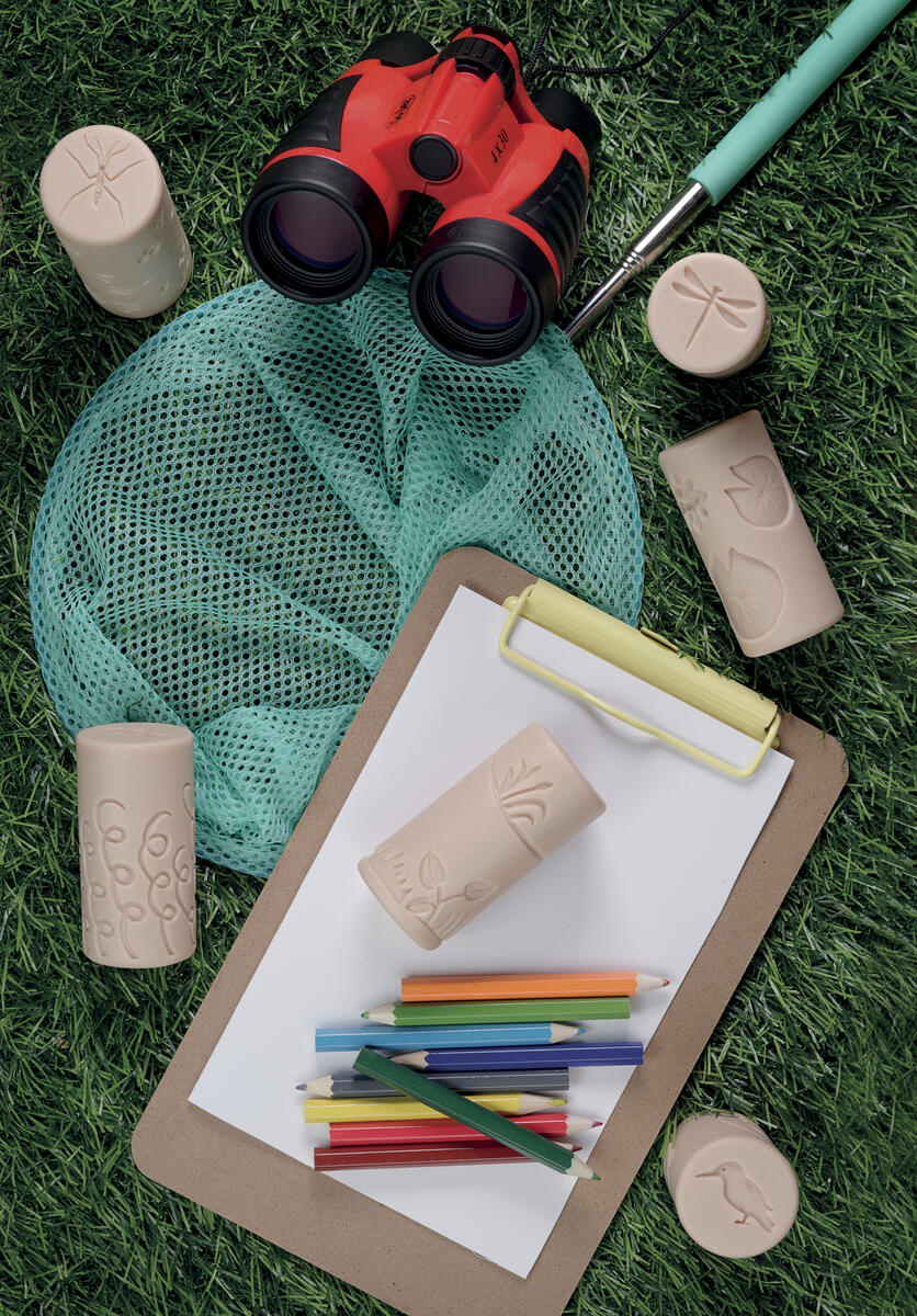 6 st/fp. Rulla sagorullen i modellera eller lera och stämpla insekterna för att skapa miljöer. Räkna bina i honungskupan, matcha nyckelpigor på blommor och berätta sagor om vad som händer när du tittar noggrannt. Barnen utvecklar sitt språk och motorik samtidigt som de skapar taktila mönster och konstverk. Setet innehåller fjäril och glänta, bi och bikupa, spindel och spindelnät, nyckelpiga och blommor, larv och gren samt gräshoppa och gräs. Mått: 72x34 mm. Lätta att rengöra med vatten. Tillverkad av sten- och hartsmix som gör att de passar bra både inomhus och utomhus. PVC-fri. Från 2 år.