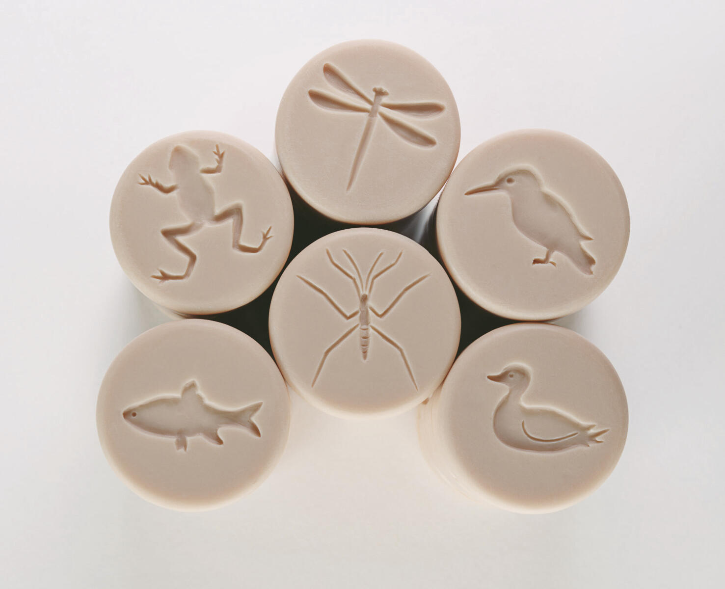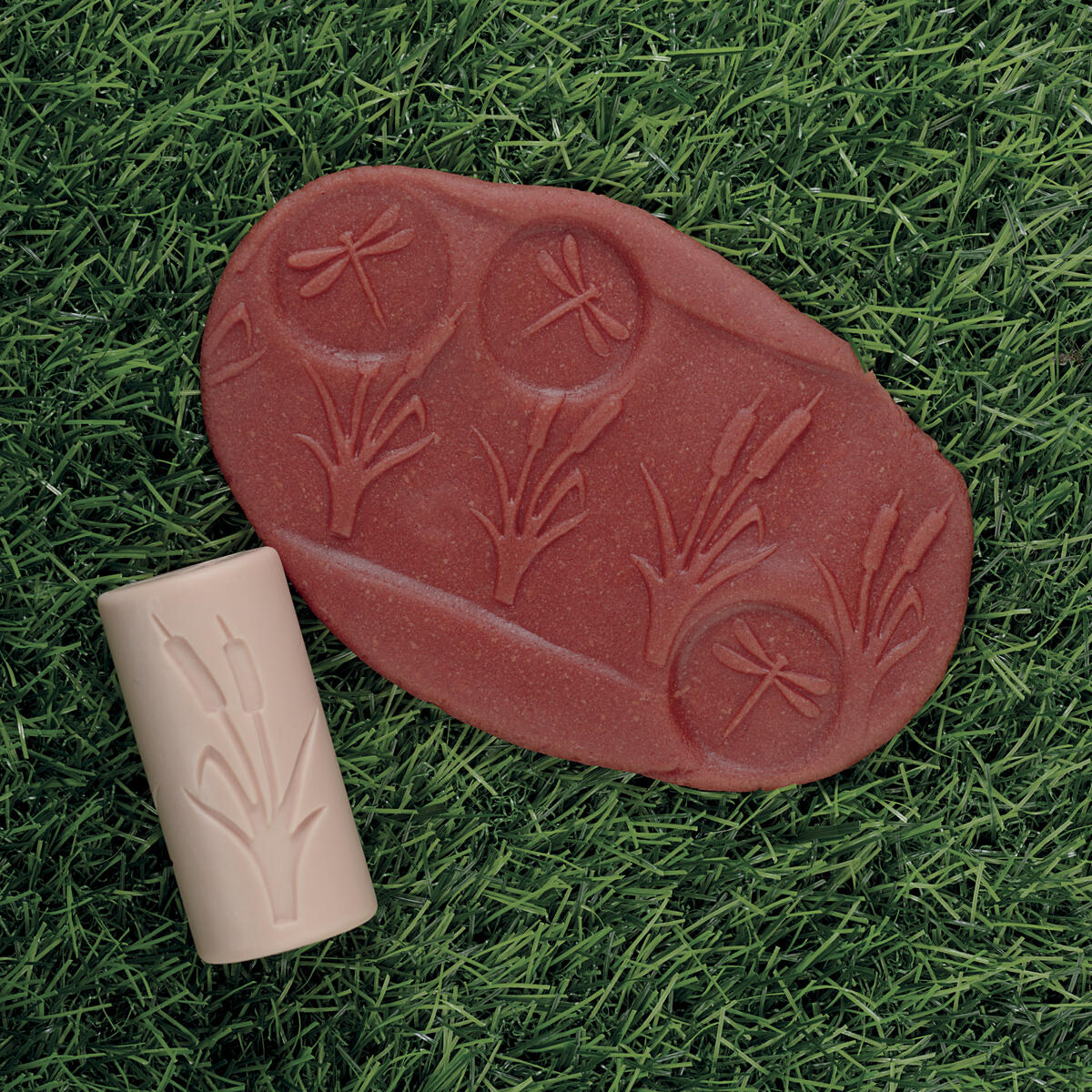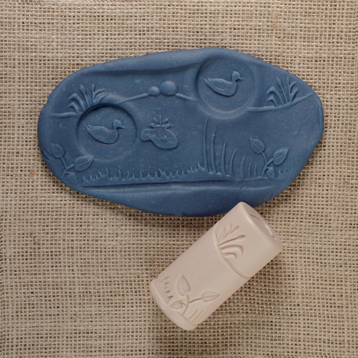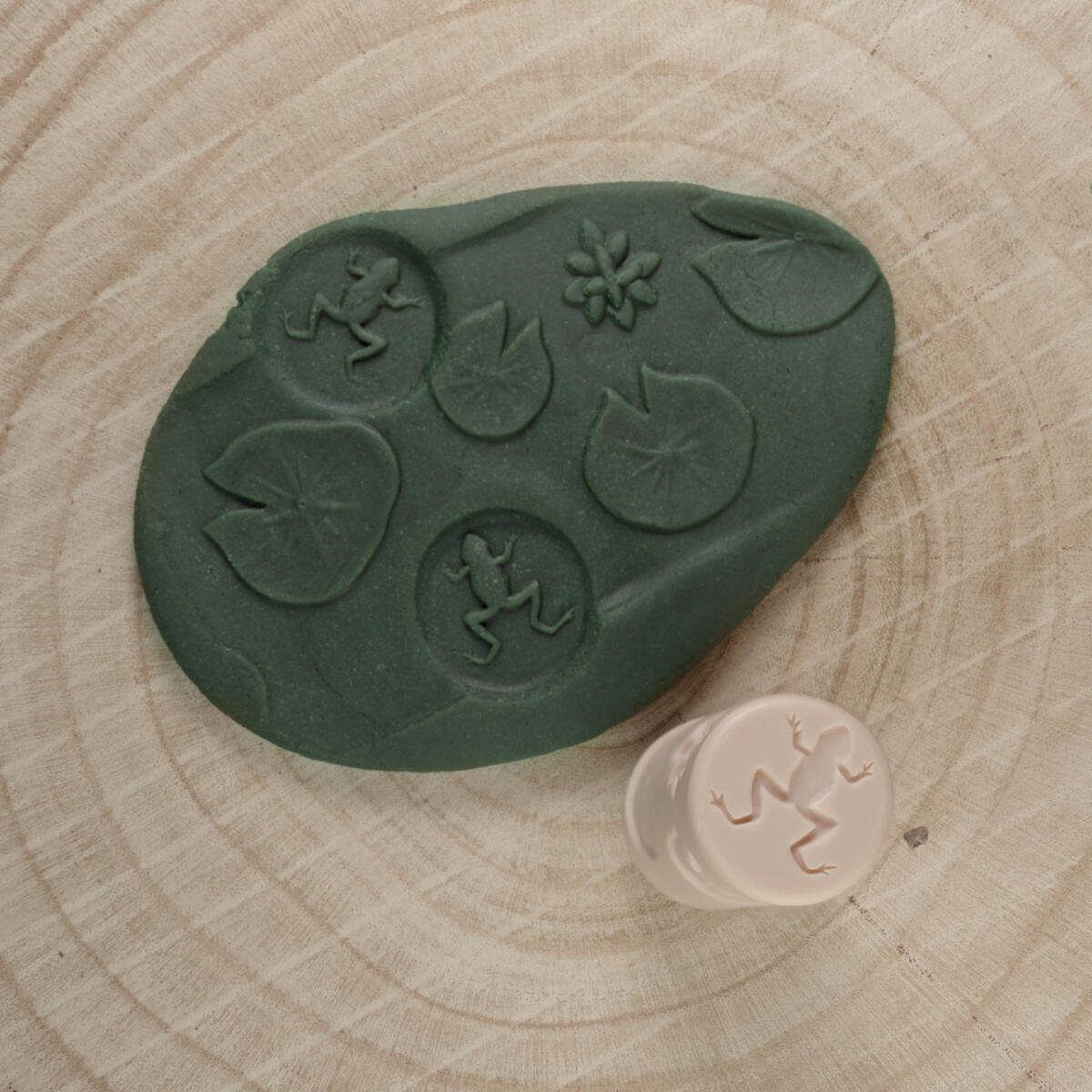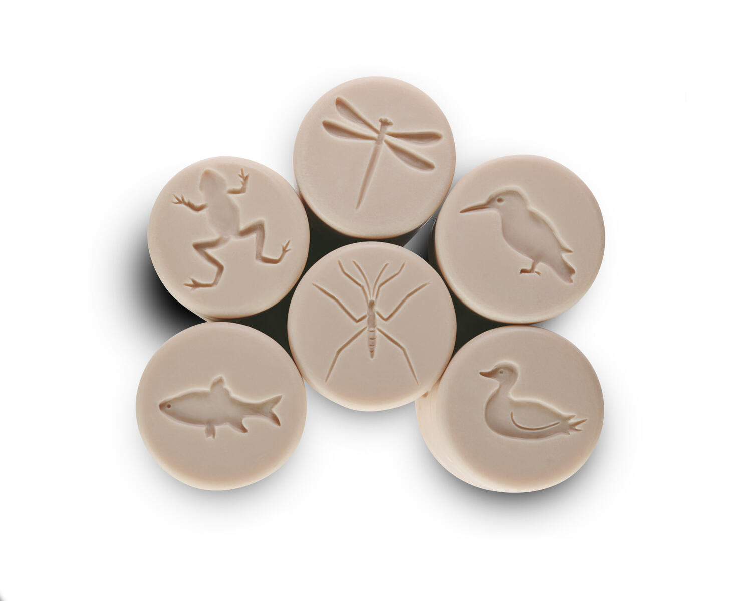 När du rullar och stämplar i modellera och lera så kommer gömda sagor fram om vad som lever i och runt om dammen. Sätt grodan på näckrosbladet eller göm fisken bland sjögräset samtidigt som du skapar sensorisk konst. Barnen utvecklar sin muskulatur i händerna genom att trycka och pressa på olika vis. Dessa 6 rullar visar groda och näckrosblad, fisk och sjögräs, anka och damm, kungsfiskare och abborre, skräddare och brödsmulor, trollslända och säv. Gjorda av stenmjöl. 6 st rullar. Mått 72x34 mm. Från 2 år.