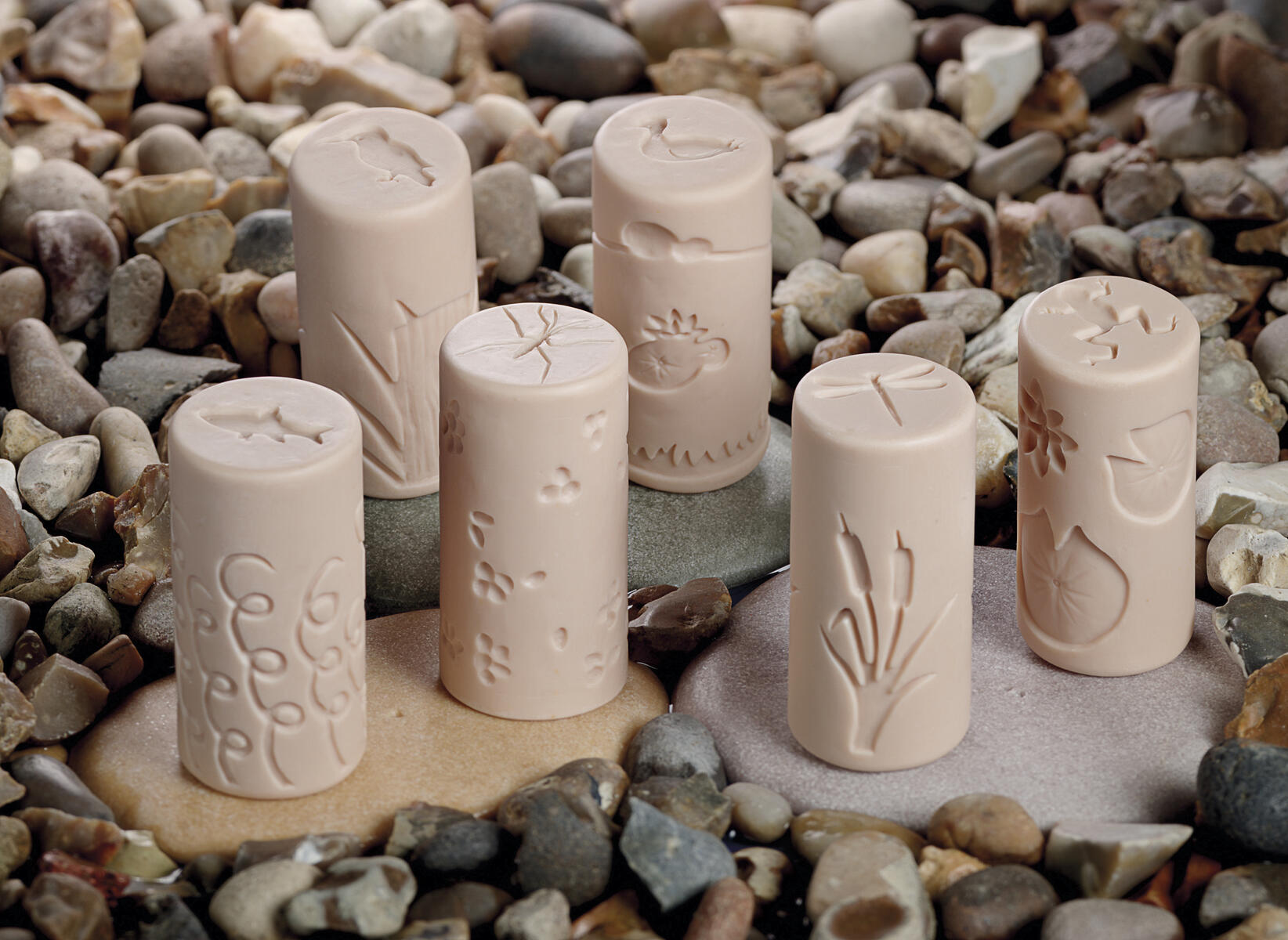 6 st/fp. Rulla i lera eller sand och stämpla kortsidan för att få fram de ingraverade motiven. På dessa rullar finns ramsor och sånger: Blinka lilla stjärna, Hickory Dickory Docka, Imse vimse spindel, Fem små grodor och Hjulen på bussen. Mått: 72x34 mm. Av stenmix. PVC-fri. Från 2 år.