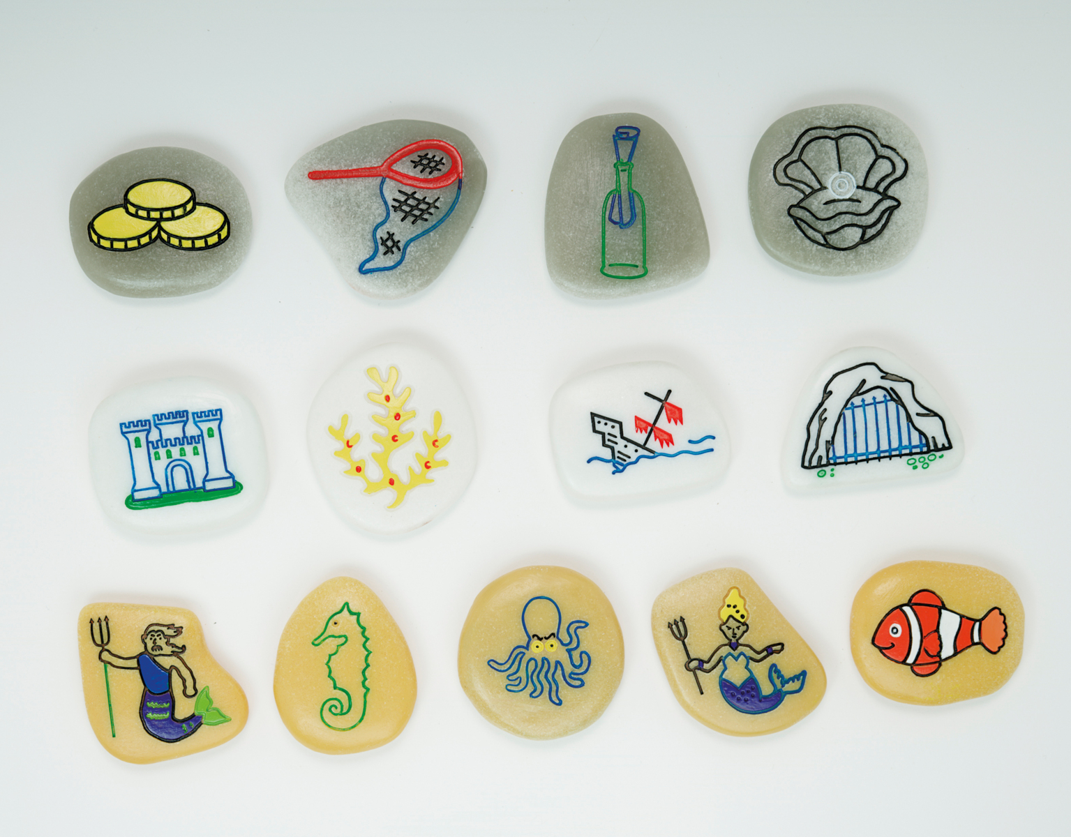 8 st/fp. Upptäck havets fantastiska djur- och växtvärld med dessa vackra, taktila stenar. Passar bra utomhus i vatten, lera och jord men även inomhus. Lätta att rengöra i vatten. Stenarna kan även användas i skapandet i leklera eller med kritor för skrubbteckningar. Innehåller: krabba, manet, hummer, sjöstjärna, valthornssnäcka, nautilussnäcka och strandsnäcka. Mått: Ca 80 mm. PVC-fri. Från 2 år.