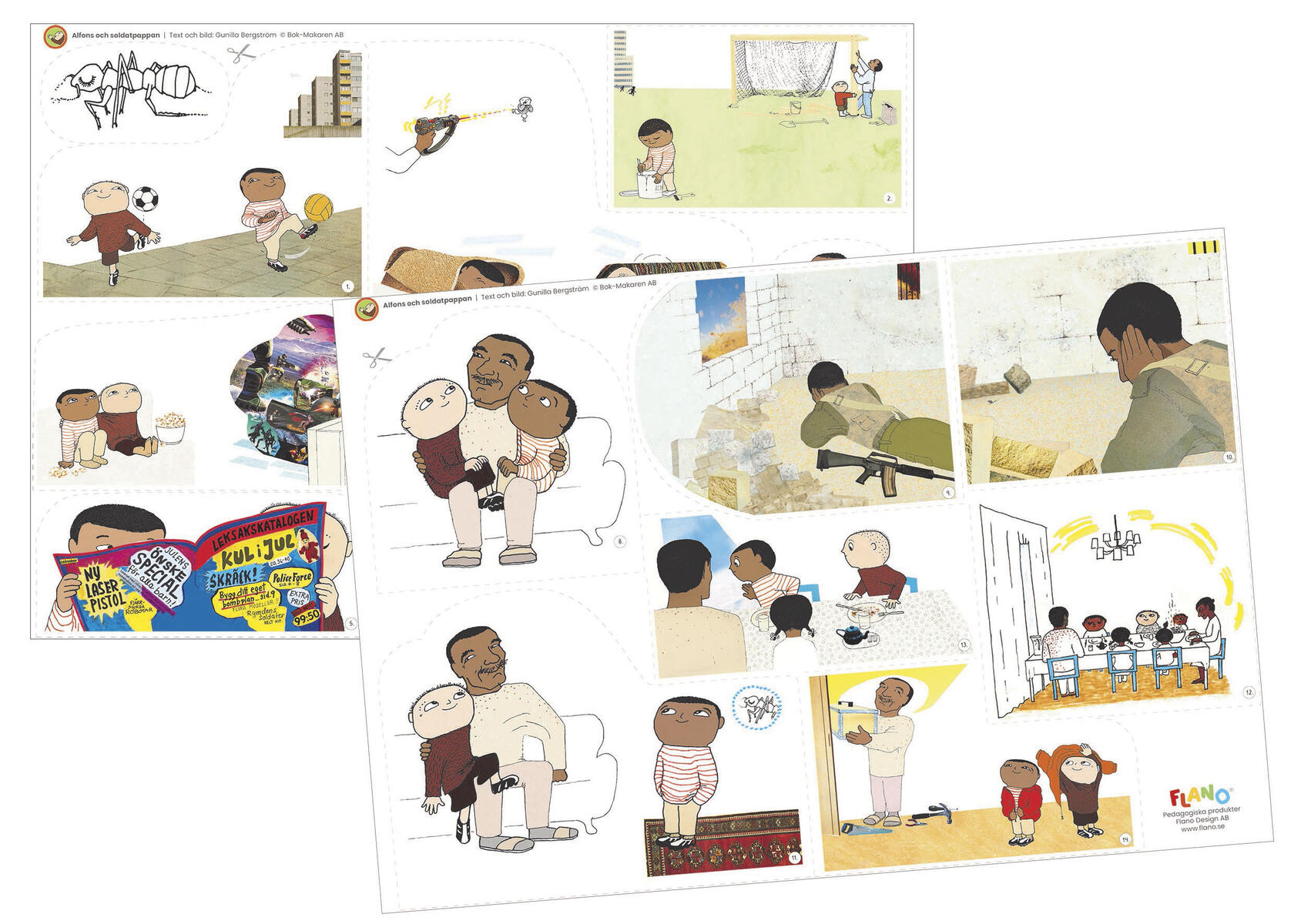 Alfons och Hamdi leker ofta krig. Men hur är riktigt krig egentligen? Hamdis pappa vill inte prata om det, det är för ruskigt. Men en sak som han var med om under ett bombanfall vill han ändå gärna berätta. Färdigtryckta flanobilder. A3-ark tryckt på tålig yta med flanellografkartong på baksidan, lätt att bara klippa ut och fästa upp direkt på flanotavlan. Svensk sagotext ingår. Av FSC-märkt papper.PVC-fri.