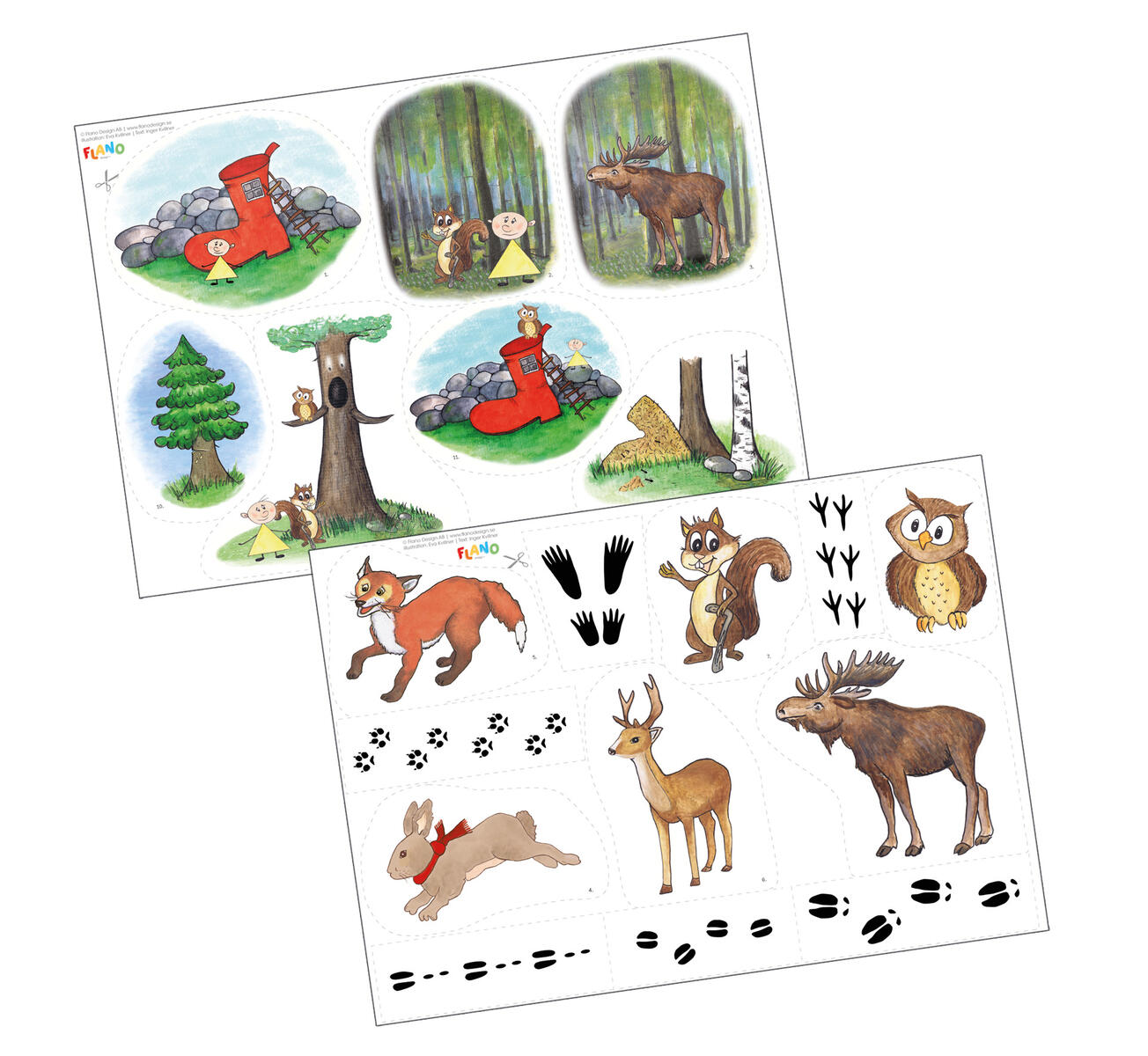 Lille Lustig känner sig ensam och blir retad för att han är annorlunda. Han ger sig av och träffar nya vänner som lär honom att olika ändå har lika värde. Sagan kan kopplas till läroplanen både gällande värdegrund men även naturkunskap då man också kan gissa djurspåren! Färdigtryckta flanobilder. Svensk sagotext ingår. Av FSC-märkt papper. PVC-fri.