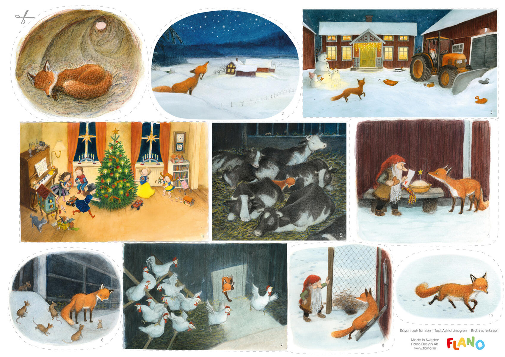 Berättelsen utspelar sig på landet, där Mickel räv smyger sig fram till gården där människorna bor. Inte märker de att han kommer tassande men gårdstomten ser honom... Färdigtryckta flanobilder. Svensk sagotext ingår. Av FSC-märkt papper. PVC-fri.