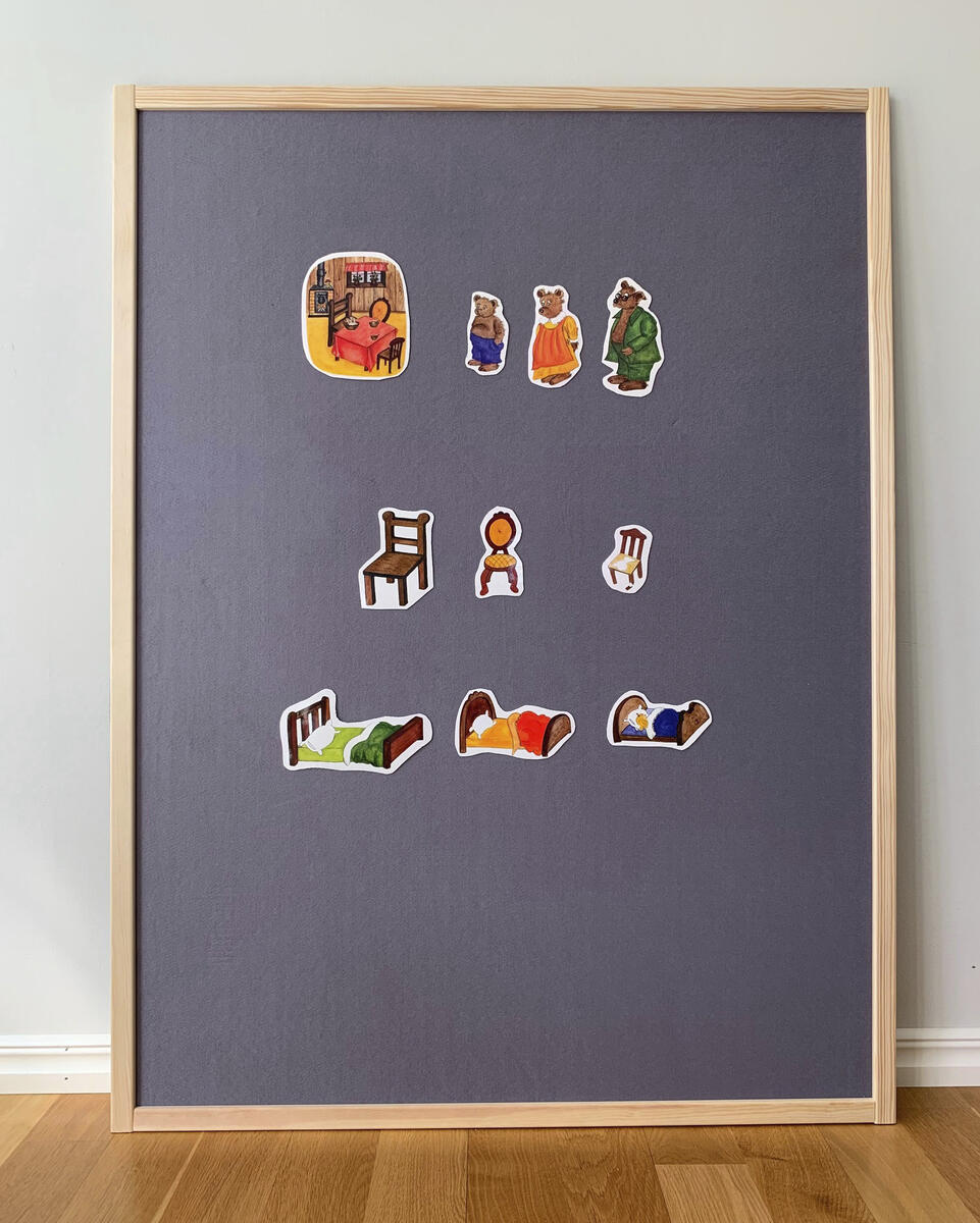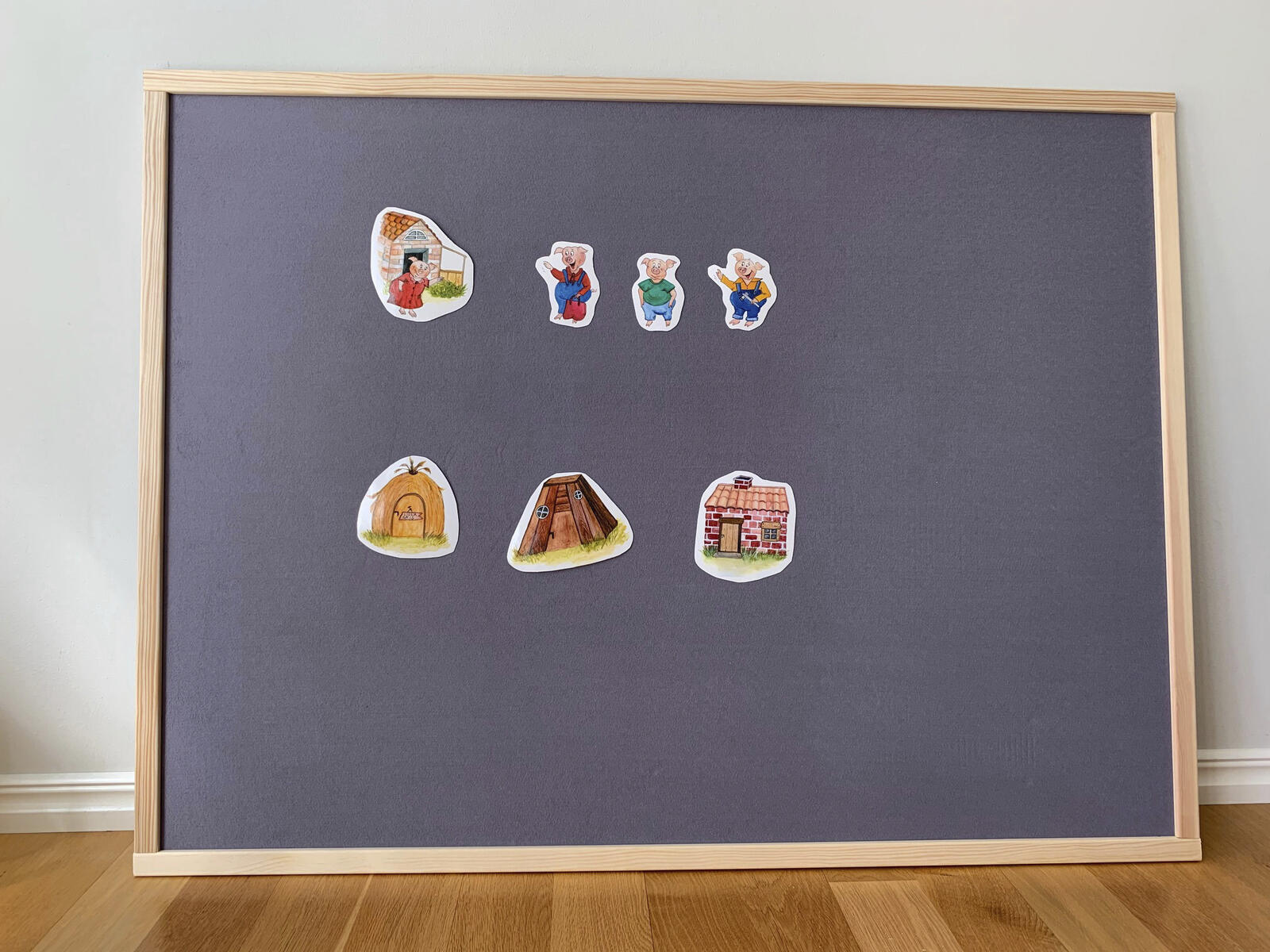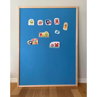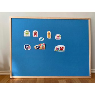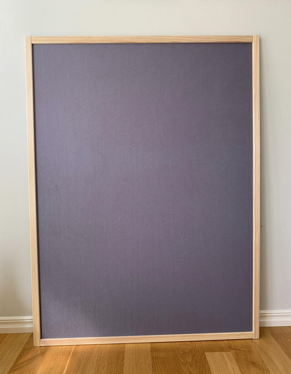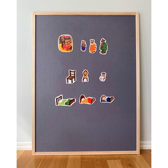 En flanellograftavla klädd med grå filt och svart träram. Med stödben på baksidan så att den kan stå fritt, samt svart upphängningsband om man vill hänga den på väggen. Mått: 90x80 cm. Av 3 mm MDF-skiva. PVC-fri.