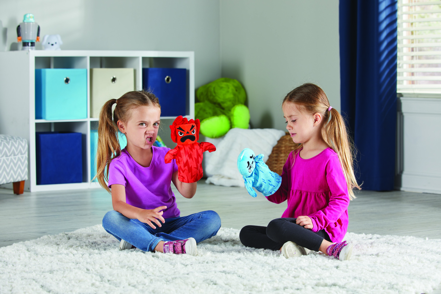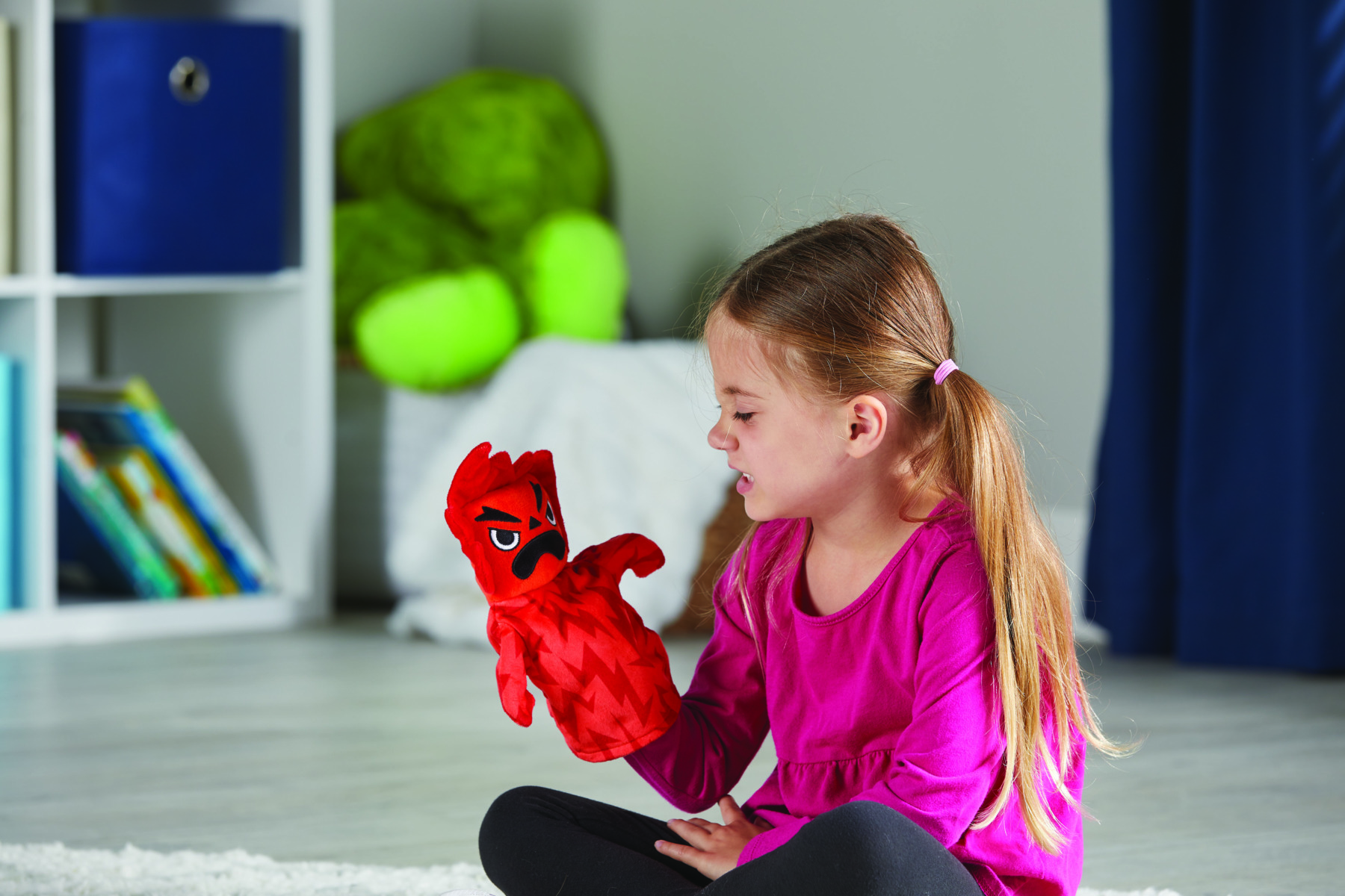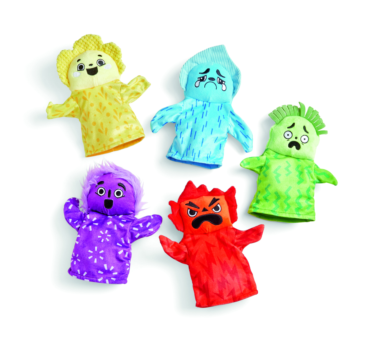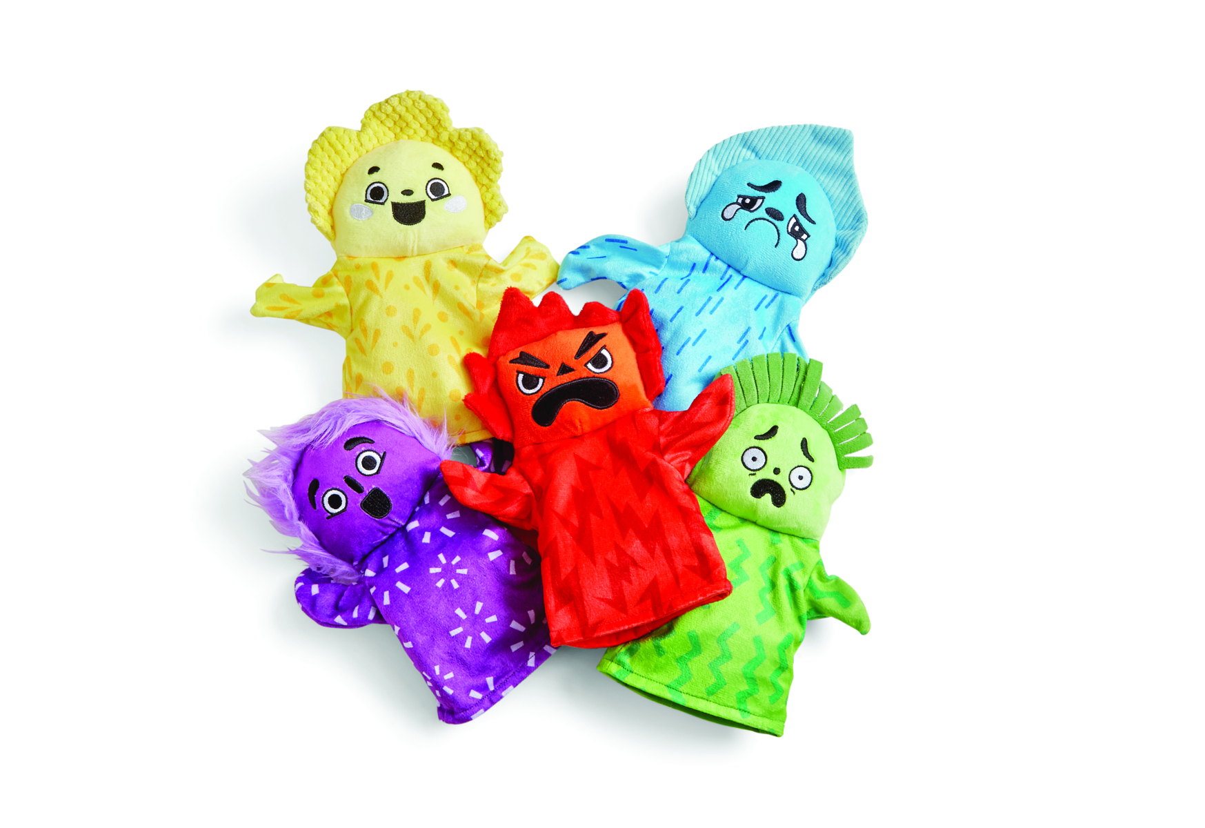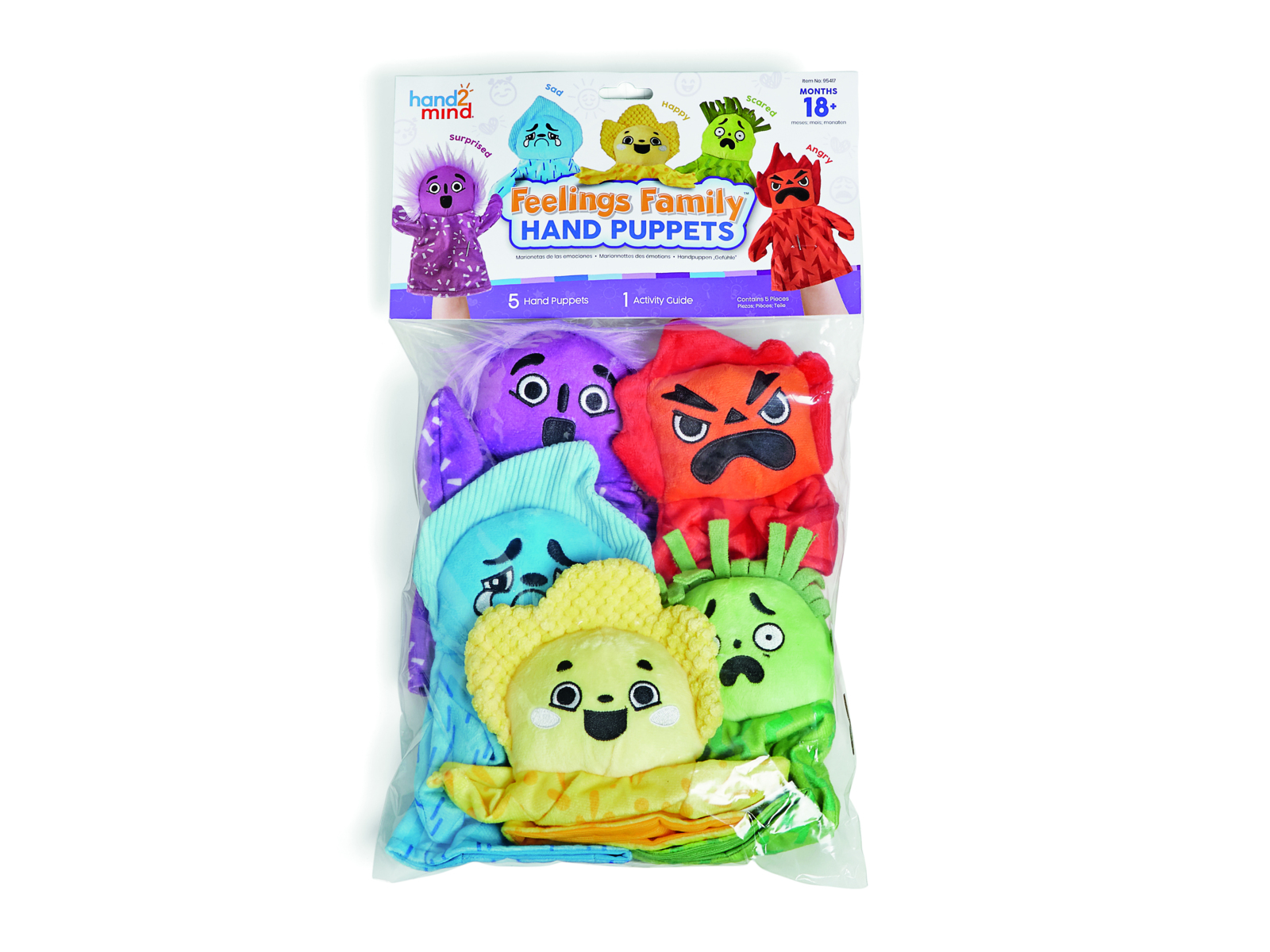 Handdockor som visar de olika känslorna rädd, arg, glad, ledsen och förvånad. Barnen lär sig känna igen sina känslor, främja relationer och bygga kontakter. Innehåller 5 dockor i polyester. PVC-fri.