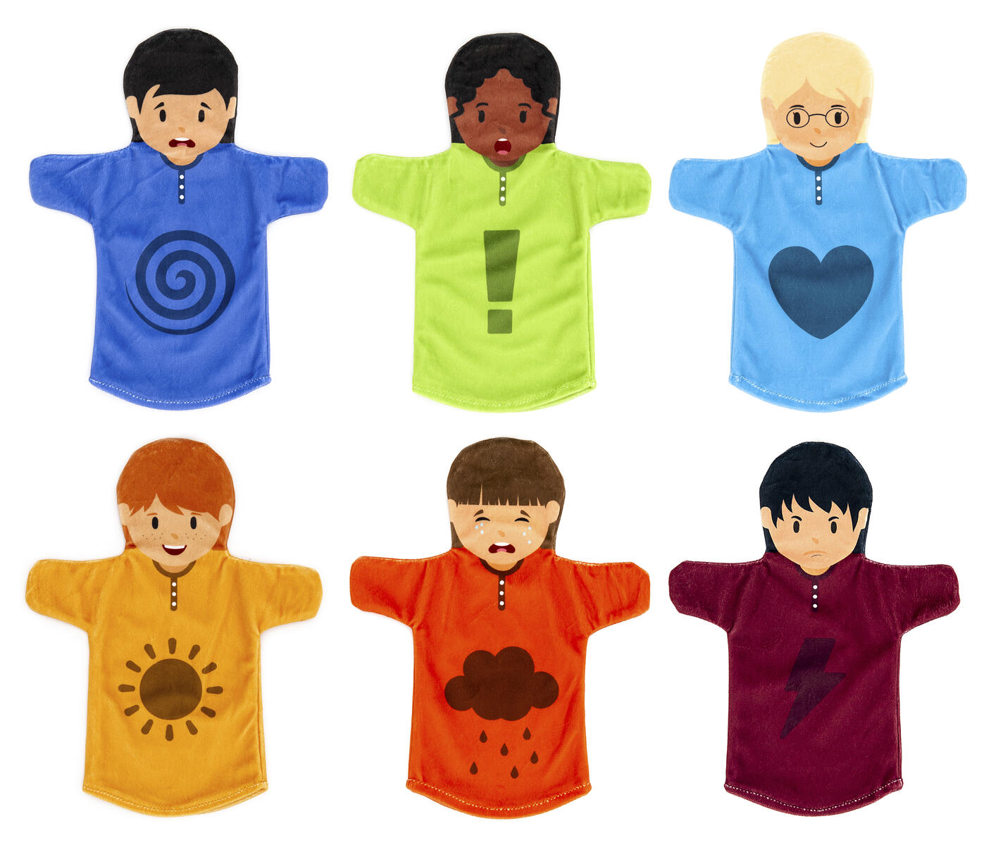 Handdockor som visar de olika känslorna rädd, arg, glad, ledsen och förvånad. Barnen lär sig känna igen sina känslor, främja relationer och bygga kontakter. Innehåller 5 dockor i polyester. PVC-fri.
