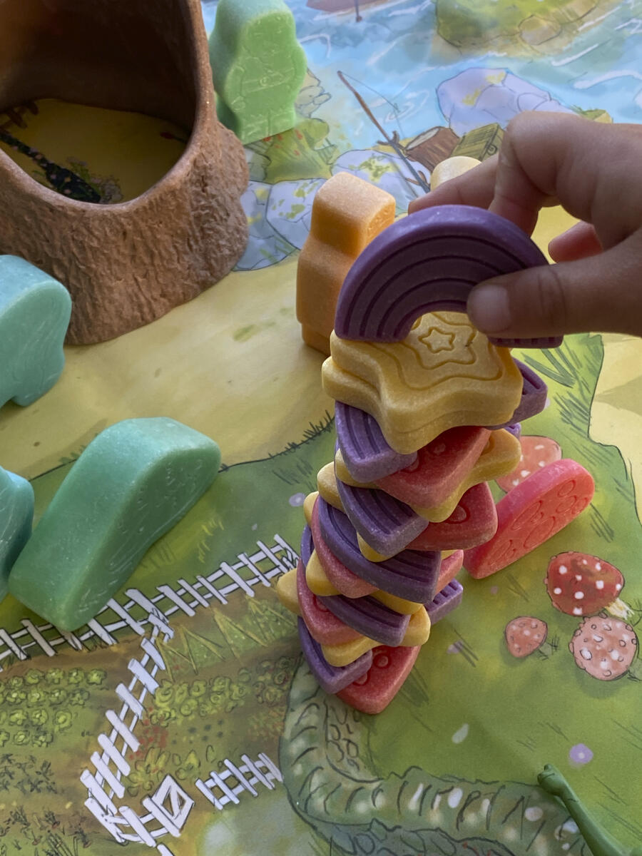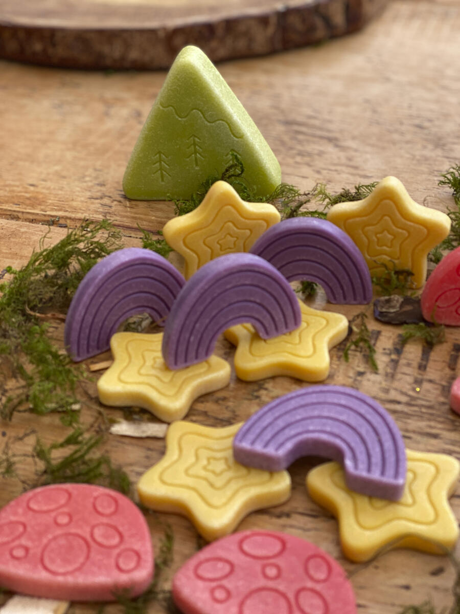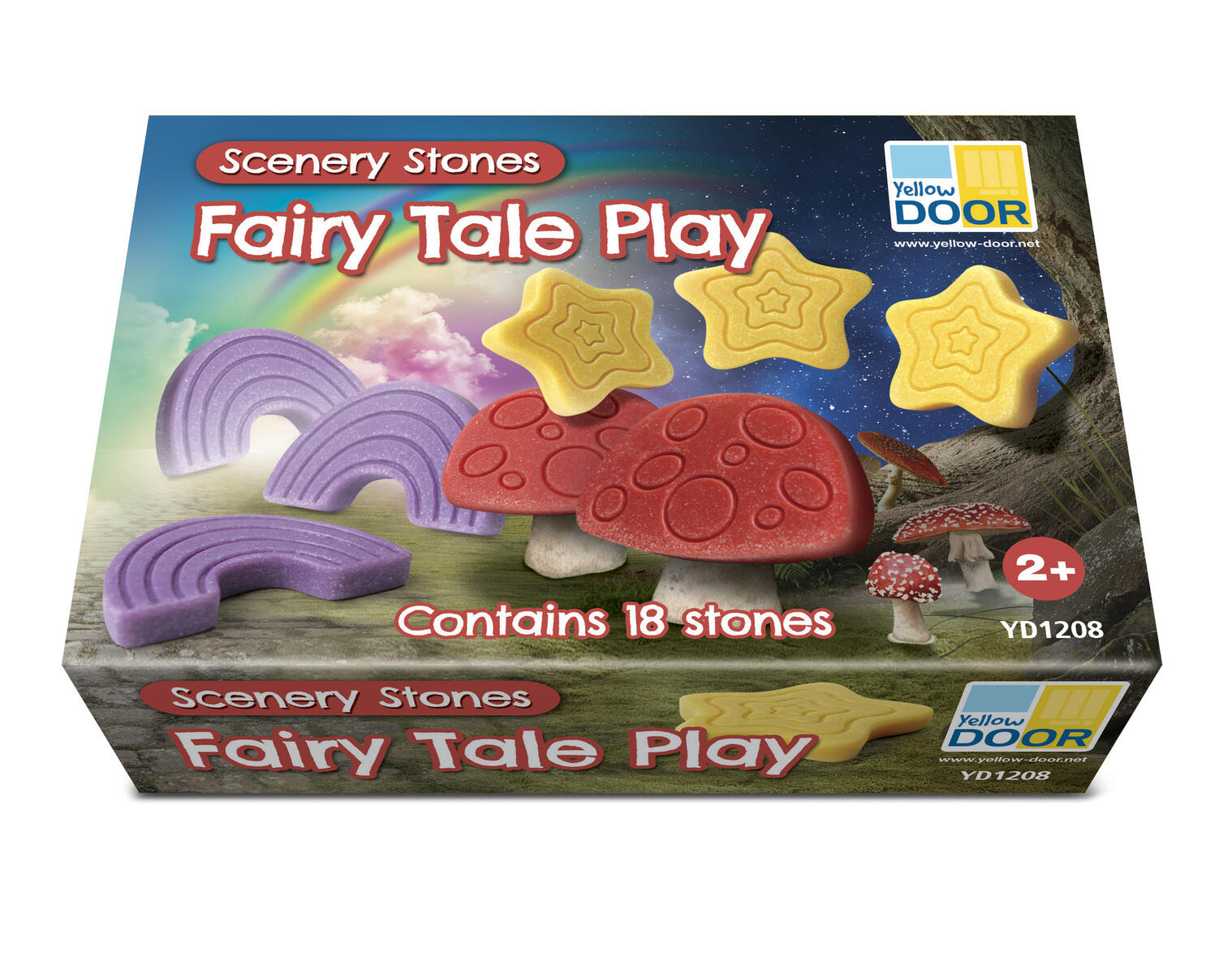 18 st/fp. Stenar med motiv av magiska regnbågar, glittrande stjärnor och svamphattar. Uppmuntrar till fantasifull lek med många olika teman, samt kan användas vid språkträning och sorteringslek. Fungerar inomhus och utomhus i vatten, lera och jord. Mått: Ca 45-50 mm. Av stenmix. PVC-fri. Från 2 år.