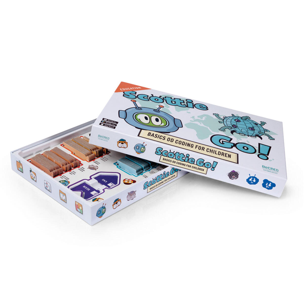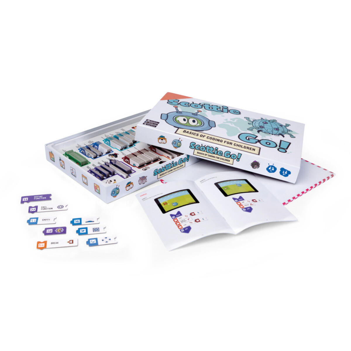 Stort set med brickor för analog blockprogrammering. Scottie Go! är en unik kombination av interaktiva mobilapplikationer och fysiska kartongplattor framtaget för att passa barn från ca 4 år. Lärare, föräldrar och särskilt barn kan snabbt få grundläggande programmeringsfärdigheter genom att lösa noggrant utformade pedagogiska uppgifter. Ett unikt programmeringsgränssnitt, i form av plattor, gör spelet barnvänligt och underlättar teamarbete, vilket eliminerar rädslan för att vissa barn kommer att vara mindre involverade i inlärningsprocessen.