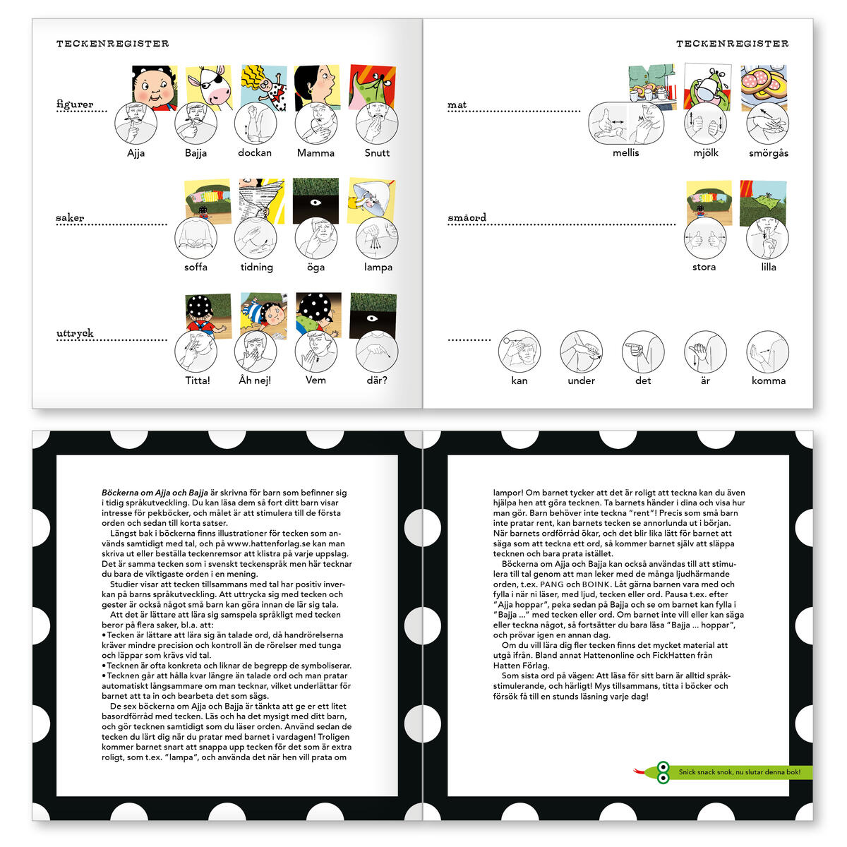 Schhh, nu är det natt. Åh vad tråkigt! Eller? Kanske tycker Ajja och Bajja att det är riktigt mysigt att gå och lägga sig... Boken "Ajja & Bajja ska sova" är en av böckerna i den härliga serien om Ajja & Bajja. Boken riktar sig till våra yngsta och förutom att roa med ett skojigt äventyr så kan den användas för att bygga ordförråd och locka fram barns första meningar. Många ljudhärmade ord gör att även de yngsta kan vara med och berätta och längst bak i boken finns uppslag med teckenillustrationer för orden. Där finns också en kort handledning i hur man kan stötta små barns språkutveckling. Böckerna om Ajja & Bajja är skrivna av logopeden och författaren Elvira Ashby. Med osviklig känsla för medryckande berättelser och stor kunskap om språkutveckling har Elvira tillsammans med illustratör Karin Holmström skapat en serie böcker, leksaker, musik och spel som både roar och stöttar språkutvecklingen. Av FSC-märkt papper. 40 sidor, 16x16 cm. Den som vill ha tecknen på varje uppslag kan komplettera med teckenremsor (artikelnummer 113670).