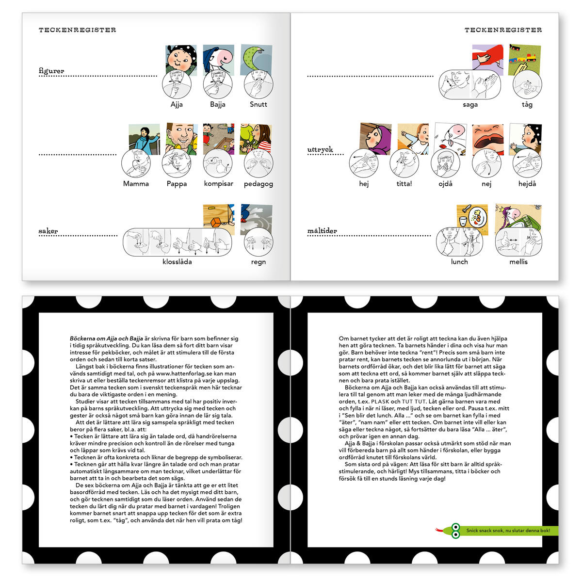 Ajja & Bajja Första Lådan innehåller massor av kul med kompisarna Ajja & Bajja. Läs, lek, spela lotto och teater. Med Ajja & Bajja utvecklar de yngsta sitt språk samtidigt som de har riktigt roligt! Lådan innehåller fyra böcker; ”Ajja & Bajja”, ”Ajja & Bajja i parken”, ”Ajja & Bajja ska sova” samt kartongboken ”Ajja&Bajjas ramsor”. Mjukisdockorna Ajja & Bajja, ett lottospel och en teaterkuliss med rekvisita ingår också. Handledning medföljer och hela materialet levereras i en praktisk plastlåda. Ett härligt fullspäckat paket för språkutvecklande lekar. Det finns teckenremsor att komplettera tre av böckerna med: Till ”Ajja & Bajja” – välj artnr 113666, till ”Ajja & Bajja i parken” – välj artnr 113668 och till ”Ajja & Bajja ska sova” – välj artnr 113670.