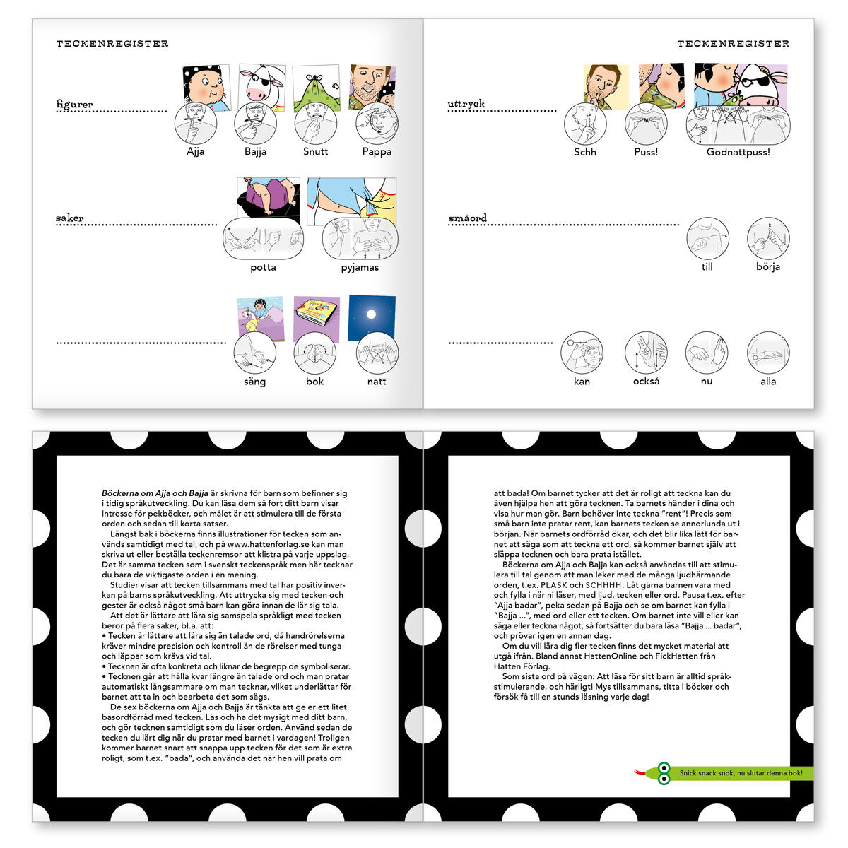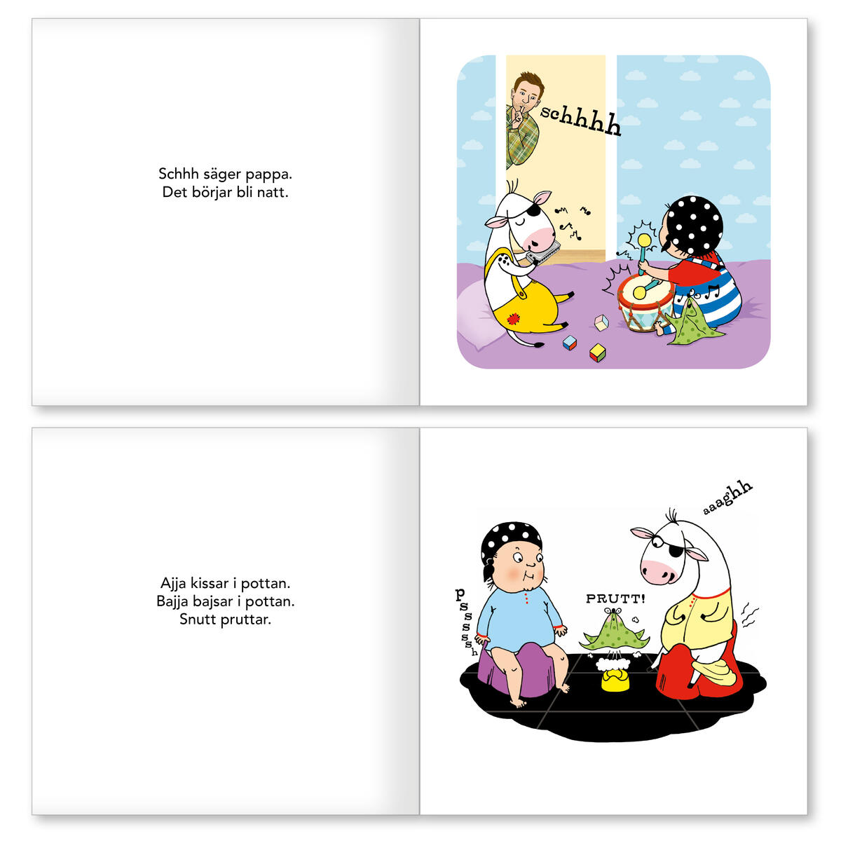 Schhh, nu är det natt. Åh vad tråkigt! Eller? Kanske tycker Ajja och Bajja att det är riktigt mysigt att gå och lägga sig... Boken "Ajja & Bajja ska sova" är en av böckerna i den härliga serien om Ajja & Bajja. Boken riktar sig till våra yngsta och förutom att roa med ett skojigt äventyr så kan den användas för att bygga ordförråd och locka fram barns första meningar. Många ljudhärmade ord gör att även de yngsta kan vara med och berätta och längst bak i boken finns uppslag med teckenillustrationer för orden. Där finns också en kort handledning i hur man kan stötta små barns språkutveckling. Böckerna om Ajja & Bajja är skrivna av logopeden och författaren Elvira Ashby. Med osviklig känsla för medryckande berättelser och stor kunskap om språkutveckling har Elvira tillsammans med illustratör Karin Holmström skapat en serie böcker, leksaker, musik och spel som både roar och stöttar språkutvecklingen. Av FSC-märkt papper. 40 sidor, 16x16 cm. Den som vill ha tecknen på varje uppslag kan komplettera med teckenremsor (artikelnummer 113670).