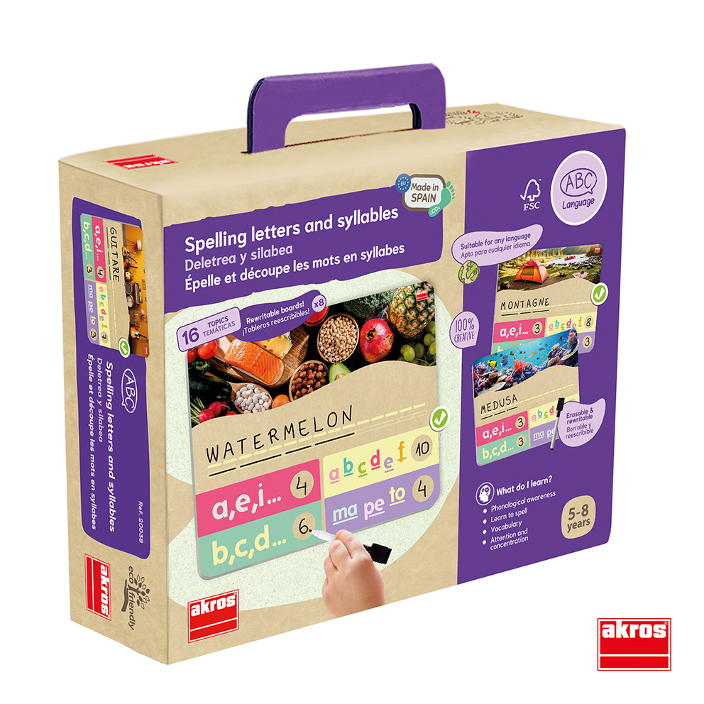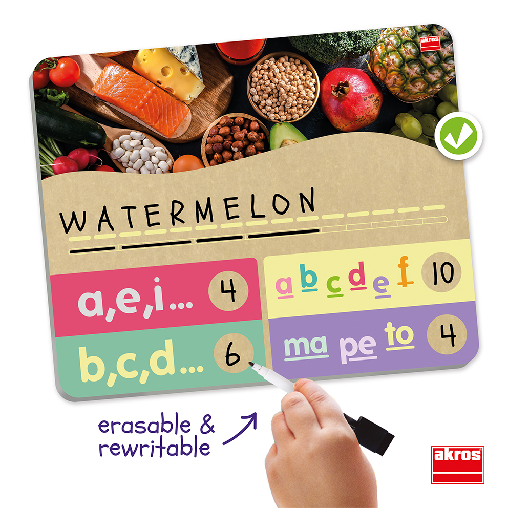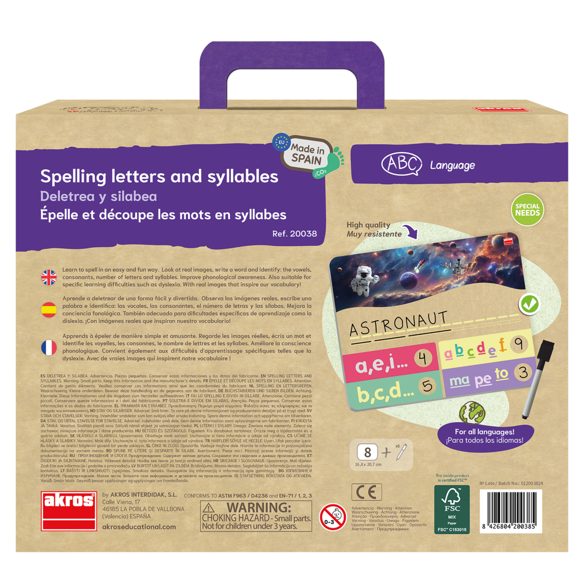 Lär dig att stava på ett roligt och lätt sätt. Titta på bilden, skriv ett ord och identifiera vokaler, konsonanter, antal bokstäver samt stavelser. Utvecklar fonetiken. Extra bra för de med diagnoser som t.ex. dyslexi. Innehåller 8 skrivplattor som man kan skriva på med de 8 whiteboardpennorna som medföljer. Sen är det bara att sudda ut och välja ett nytt ord. FSC. Från 5 år.