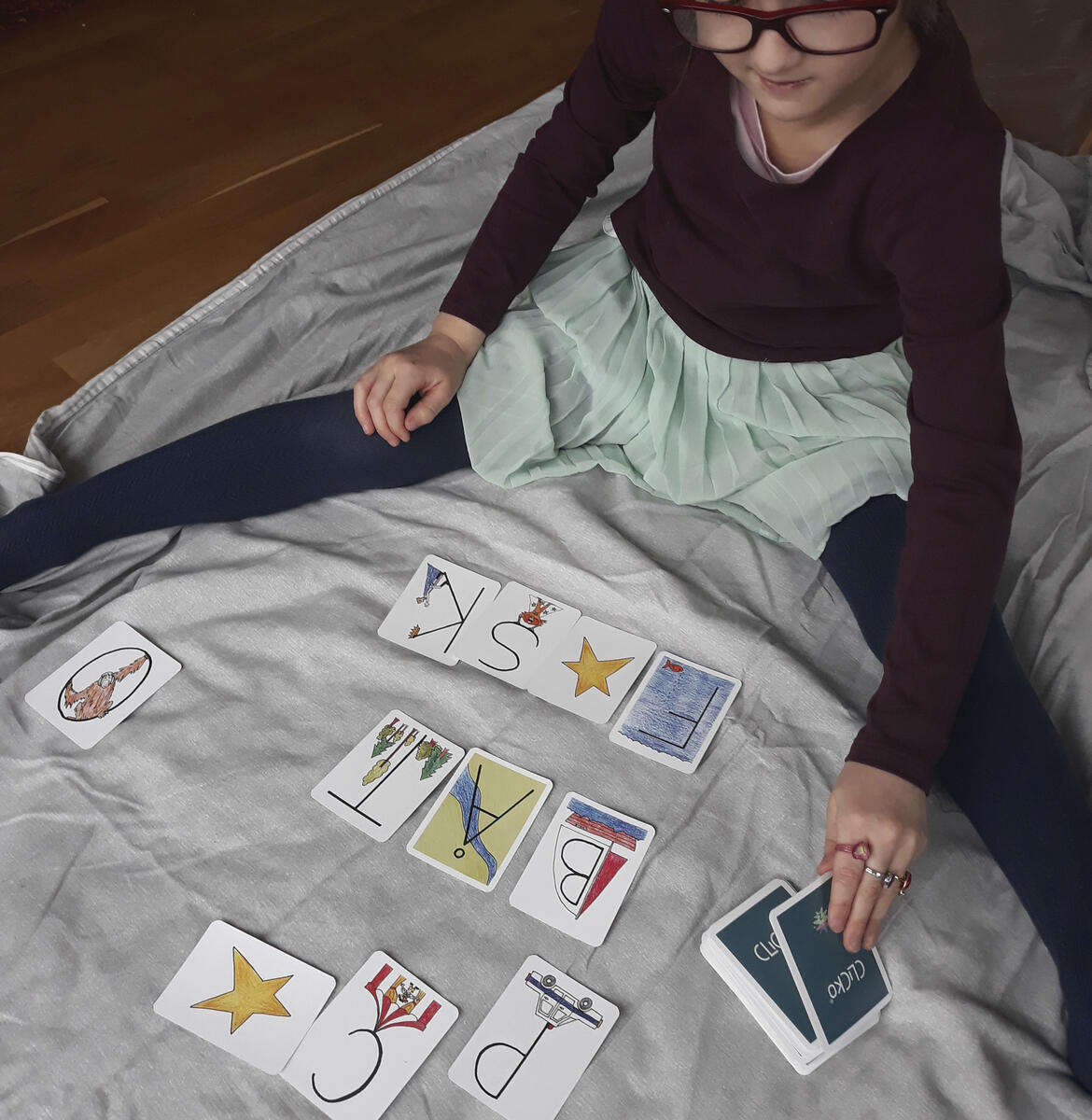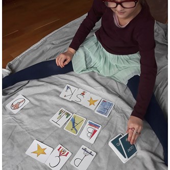 Tecken ABC - en kortlek med stora härliga spelkort med alfabetets alla bokstäver, illustrerade med handalfabetet. Om du inte redan har gjort det - prova att använda tecken när ni leker med bokstäver och ljudar fram ord. Genom att också använda händerna går inlärningen snabbare och kunskaperna stannar kvar bättre. Det är lättare att göra bokstäver och ord med händerna och för många blir handövningarna vägen in i ljudandet och läsandets värld. Att använda tecken är både roligt och handgripligt! Använd korten för att spela och lek med att ljuda fram olika bokstäver och ord. Kortleken innehåller 29 bokstäver (röda vokaler och mörkt blå konsonanter) och 24 kort med teckenljudade ord som bildar par genom att de rimmar.