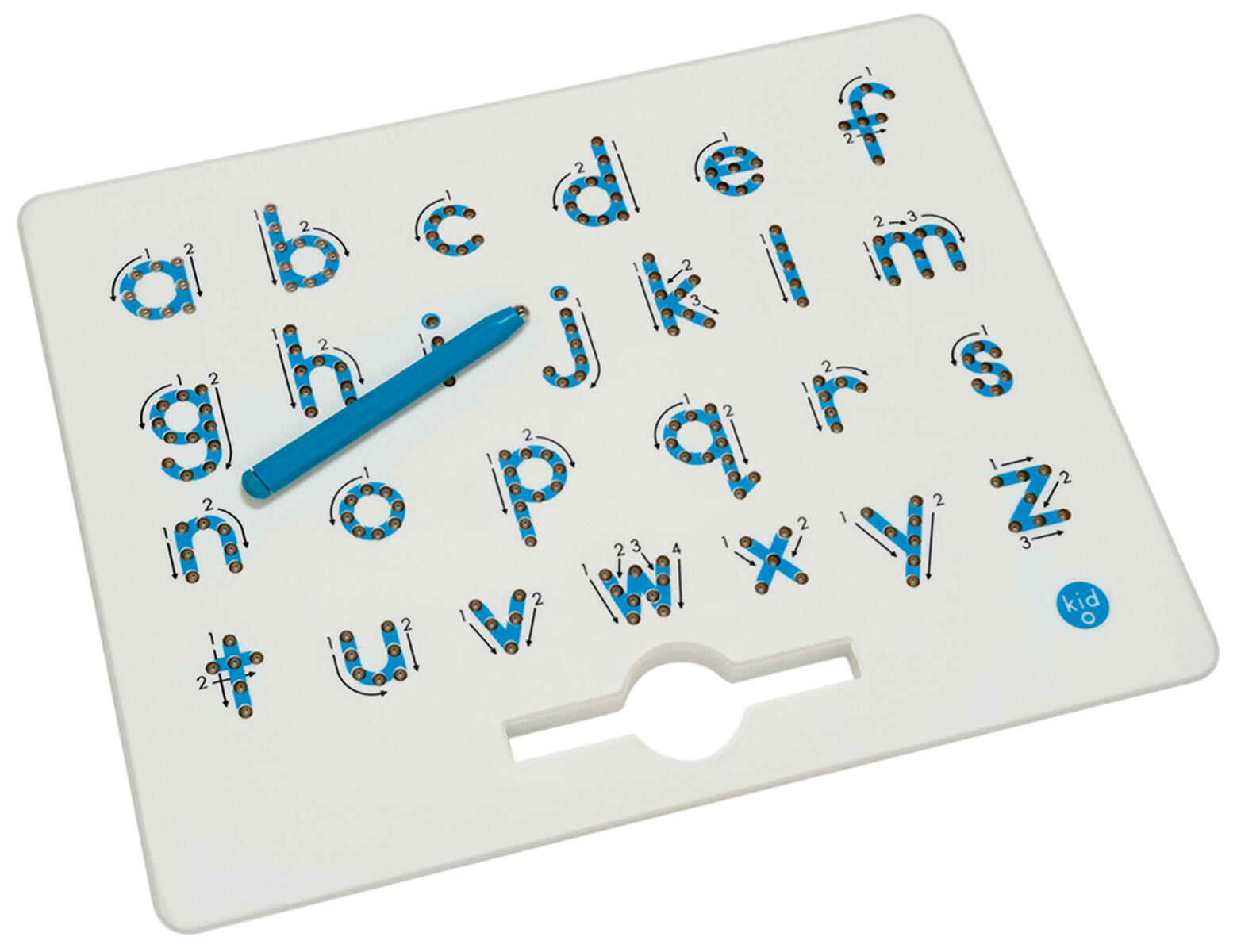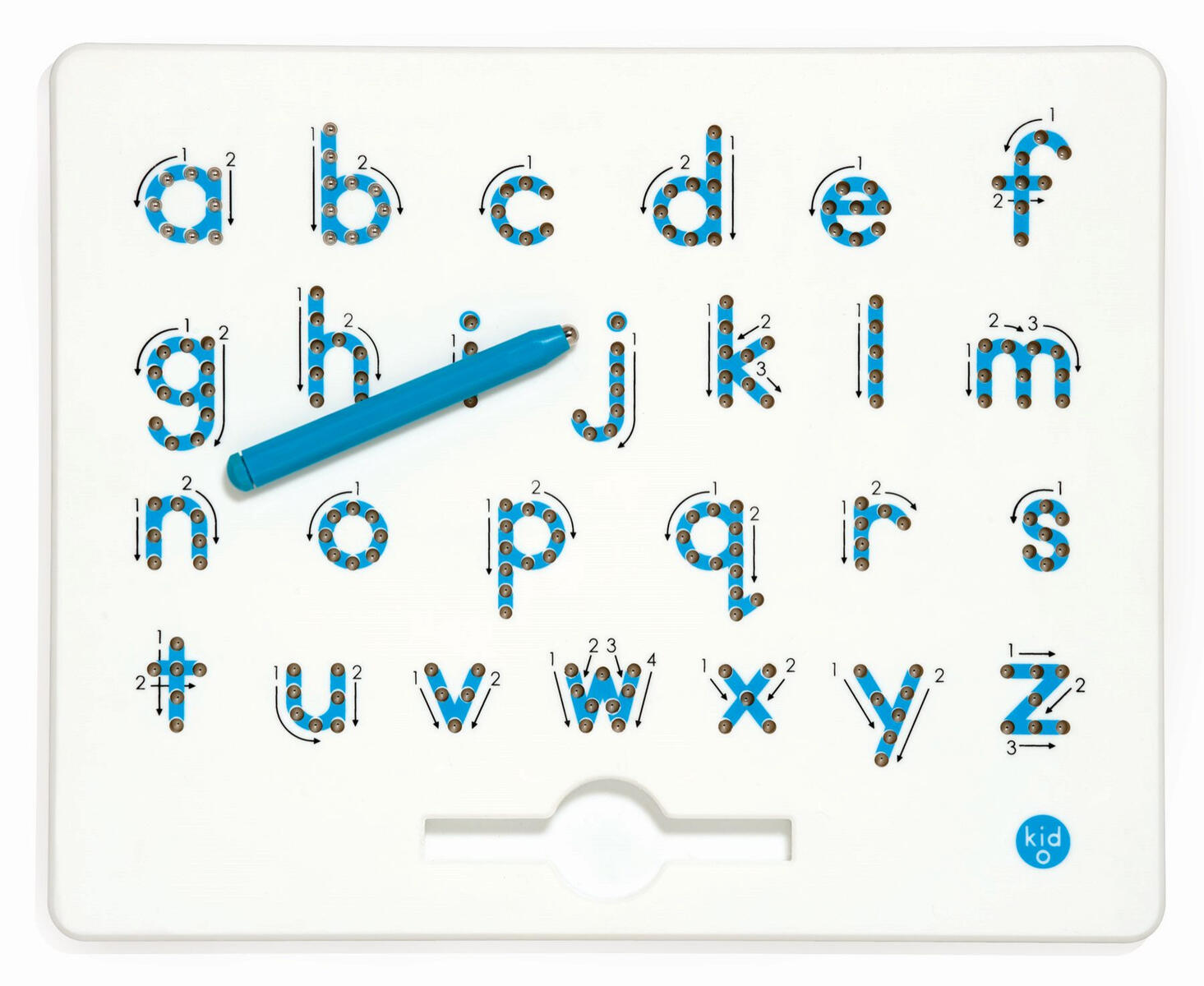 Här får barnen på ett roligt och unikt sätt lära sig att skriva sina första bokstäver. Genom att följa linjerna med den magnetiska pennan tränas rätt skrivriktning. När man drar pennan över bokstäverna fylls dessa i av metallkulorna och genom att dra fingret över siffran åker kulorna tillbaka och produkten kan användas om och om igen. Gemena alfabetet med bokstäverna från a-z. Av ABS. PVC-fri. Från 3 år.