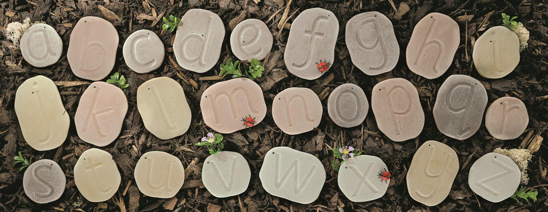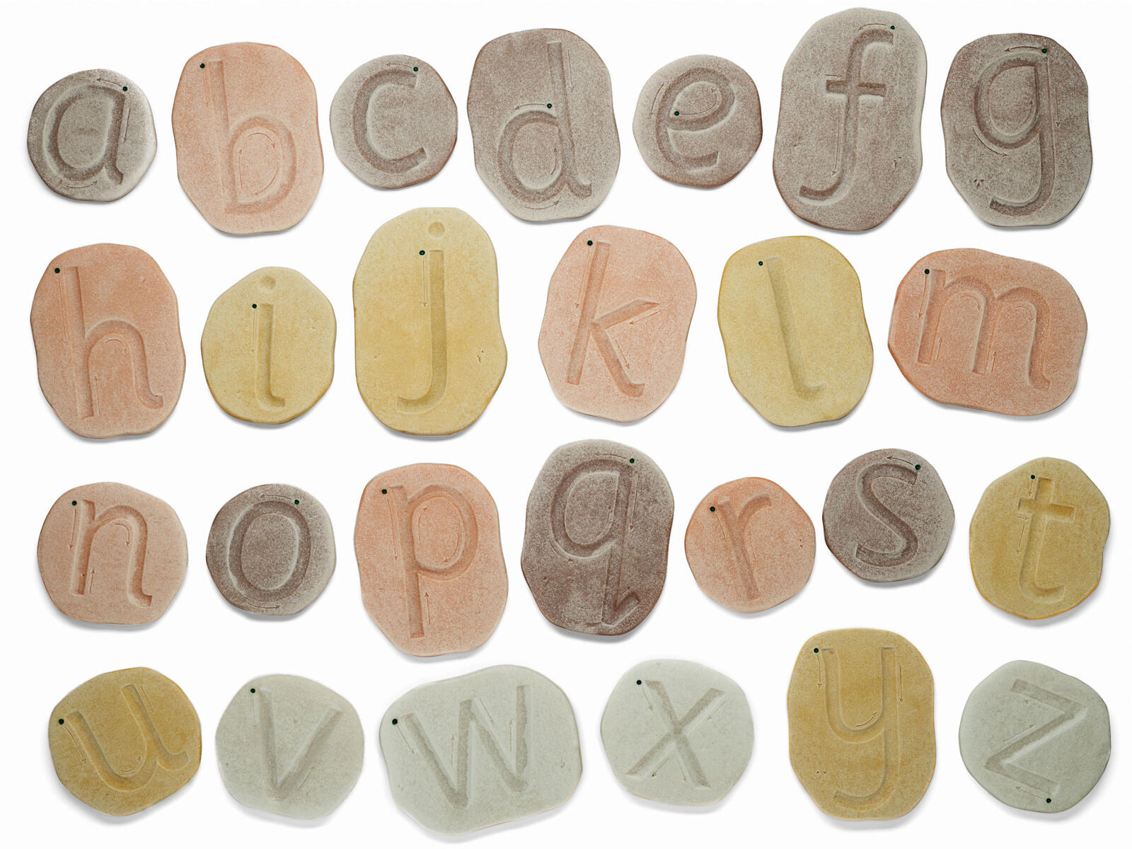 26 st/fp. En uppsättning stenar med små bokstäver a-z försänkta i stenarna. Stenarna ger en både taktil och visuell upplevelse för barnen när de övar på bokstäver. Börja på den gröna punkten och styr sedan fingret längs med pilens riktning. Barnen bygger det viktiga motoriska minnet och utvecklar de grundläggande rörelserna som behövs innan de kan få en flytande handstil. Stenarna kan användas både inom- och utomhus. Mått: 7,5-10,5 cm. PVC-fri. Från 2 år.
