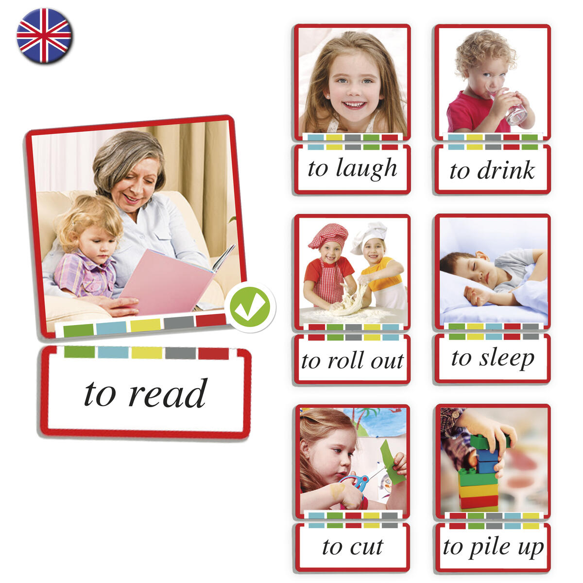 156 kort/fp. Denna box innehåller fotografier som visar ord och begrepp inom femton olika kategorier, bl.a. färger, kroppen och väder. Varje fotografi har på ena sidan det engelska ordet för det som kortet föreställer, och på andra sidan samma bild fast med plats för att själv skriva ordet på det språk man vill. Ytan är skrivbar och avtorkningsbar om rätt sorts penna används. Engelskan kan vara ett bra översättningsled för barn som har med sig engelskan som ett första- eller andraspråk. Materialet fungerar också i den ordinarie engelskundervisningen. Mått kort: 9x9 cm.