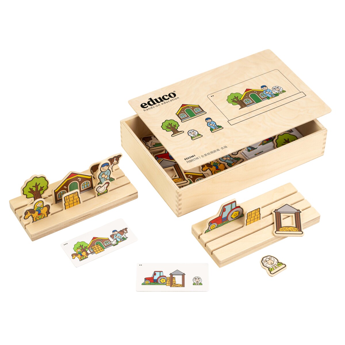 20 träfigurer, 12 uppgiftskort i plast, 2 hållare i trä, trälåda för förvaring. Bygg upp scenografier i perspektiv och berätta vad du ser. Stimulerar rumsuppfattning och ordförråd. Känn igen och namnge begrepp som framför, bakom, mellan, vänster och höger. Mått trälåda 33,5x22,5x7 cm. Från 3 år.